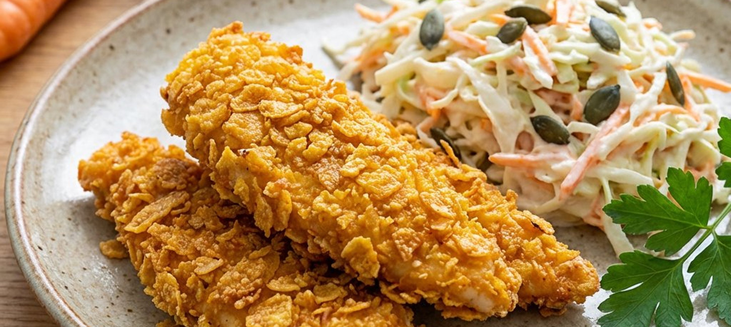 - 2Die marinierten Hendlstreifen einzeln in den Cornflakes-Bröseln wenden, dabei die Panier leicht addrucken. Die Nuggets auf das vorbereitete Blech legen.