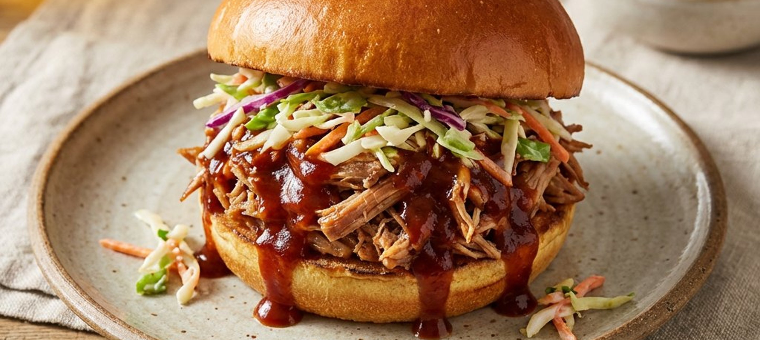 - 1Die Brioche Burger Buns aufschneiden. Die untere Hälfte mit BBQ-Sauce bestreichen, das erwärmte Pulled Pork darauf verteilen und mit Coleslaw toppen. Obere Brötchenhälfte aufsetzen und servieren.