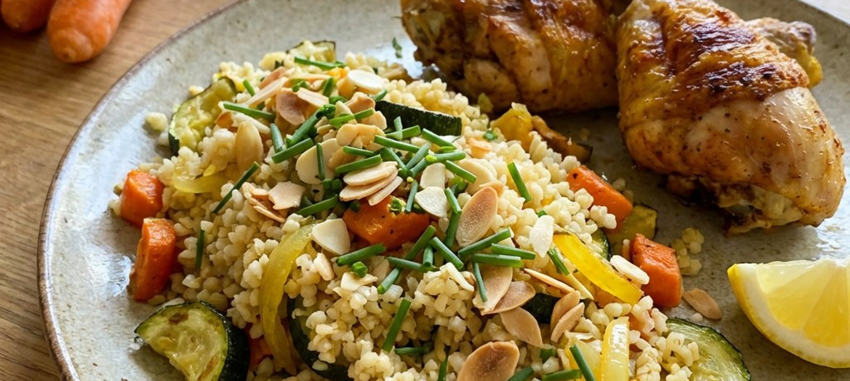 - 2Das Hendl aus der Form nehmen und das Fleisch von den Knochen lösen (auslösen). Das gebratene Gemüse aus der Form zusammen mit dem fein geschnittenen Schnittlauch und den Mandelblättchen unter den Bulgur mischen.