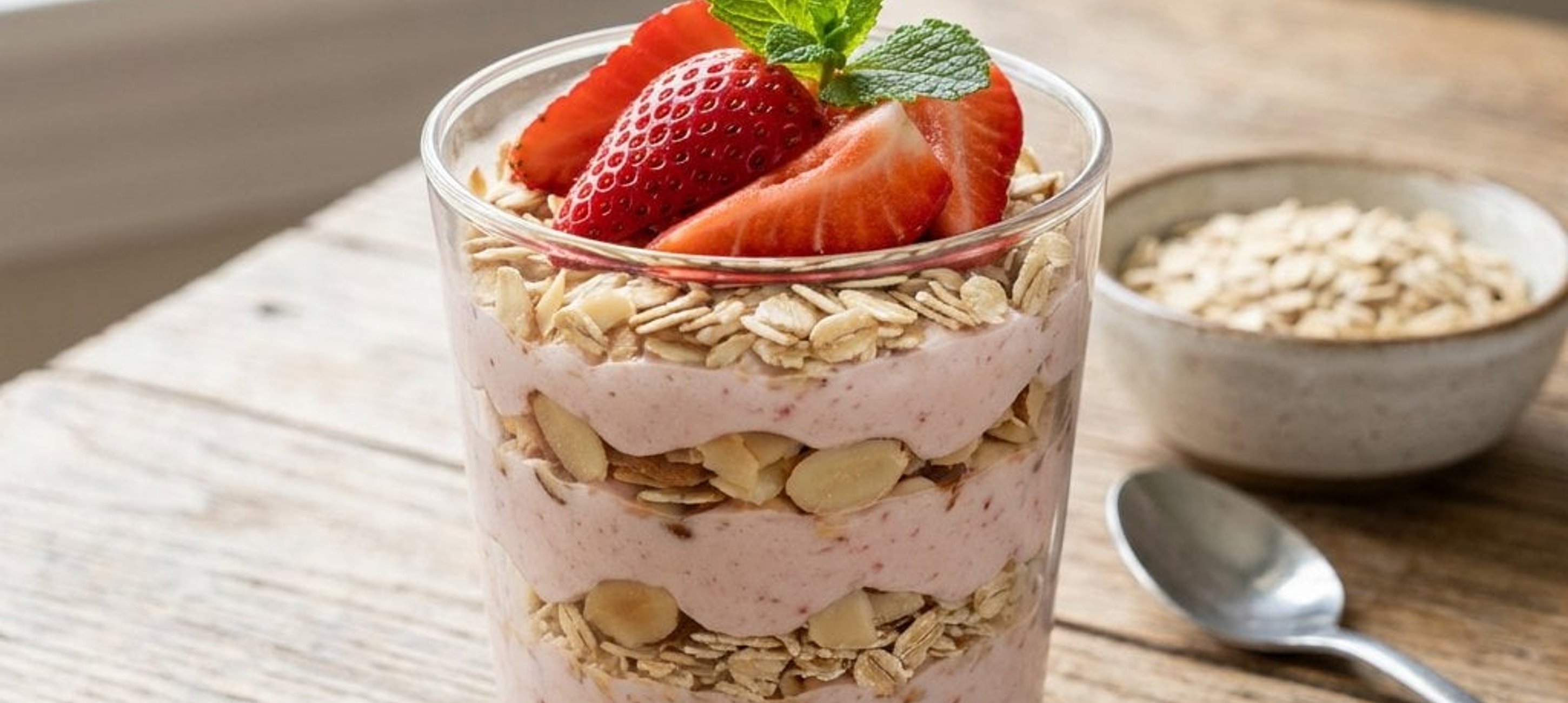 Dieses Parfait eignet sich hervorragend als leichter Snack. Wenn Sie es als vollwertiges Frühstück genießen möchten, erhöhen Sie die Menge der Haferflocken einfach auf 120 g.