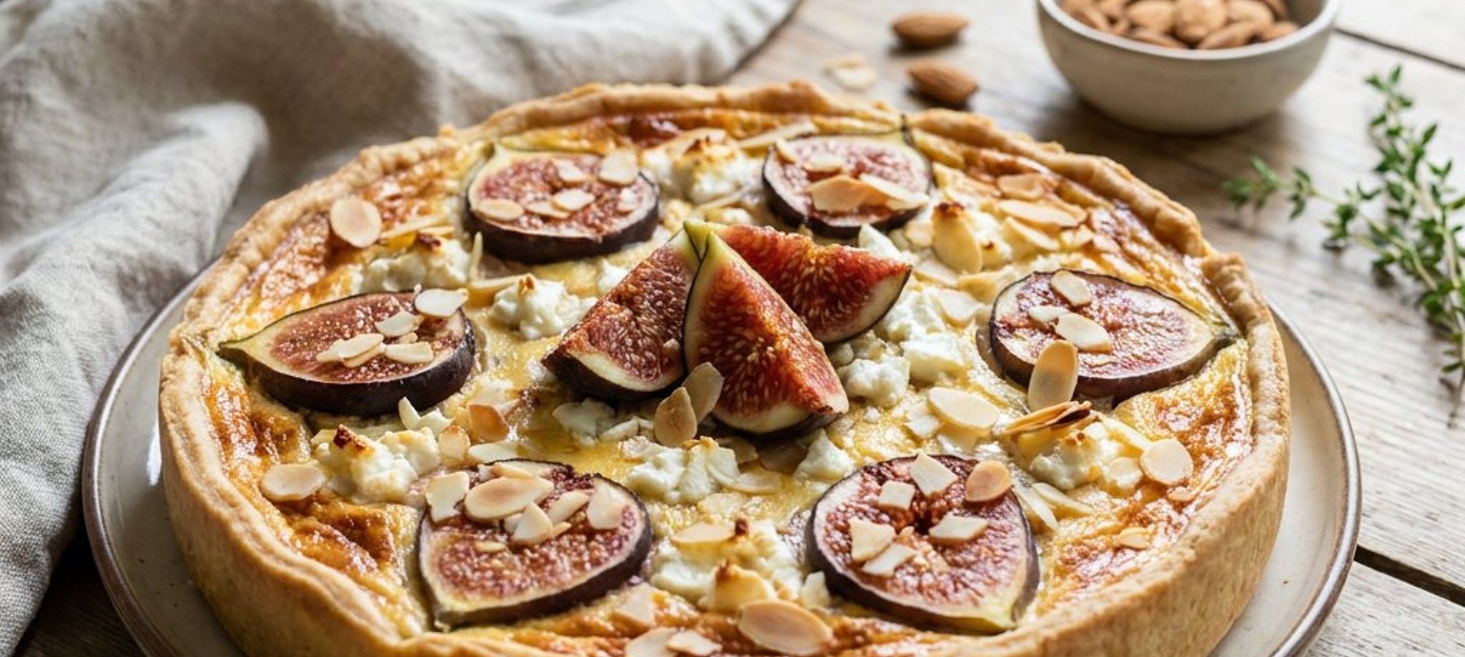 - 1Den Ofen auf 180 Grad vorheizen. Den Teig dünn ausrollen und eine runde Form (ca. 25 cm Durchmesser) damit auskleiden. Den Boden mit einer Gabel mehrmals einstechen und im vorgeheizten Ofen 20 Minuten blindbacken. Danach die vorbereitete Füllung hineingeben. Die frischen Feigen in Scheiben schneiden und dekorativ auf der Quiche verteilen. Mit den restlichen Mandelblättchen und dem restlichen Ziegenfrischkäse bestreuen. Die Quiche für weitere 35–40 Minuten bei 180 Grad backen, bis sie goldbraun und fest ist.