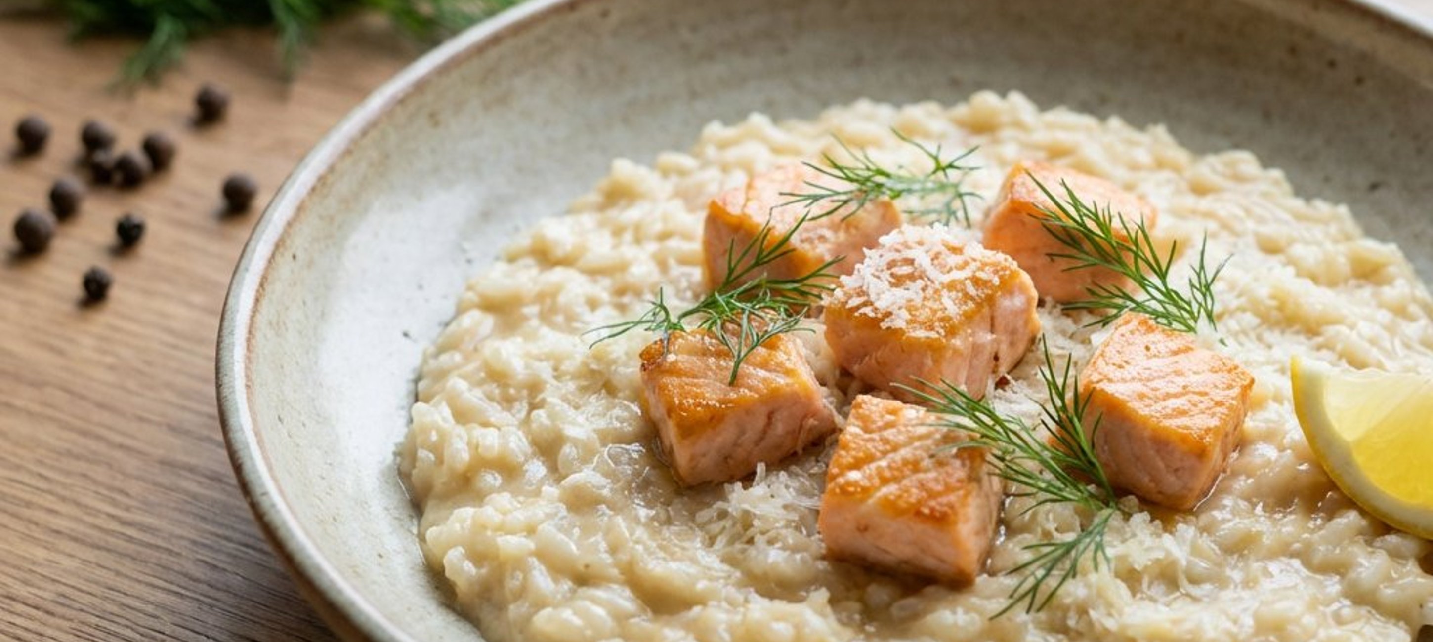 - 5Das Risotto auf Tellern anrichten, die gebratenen Lachswürfel darauf verteilen und mit frischen Dillzweigen garniert servieren.