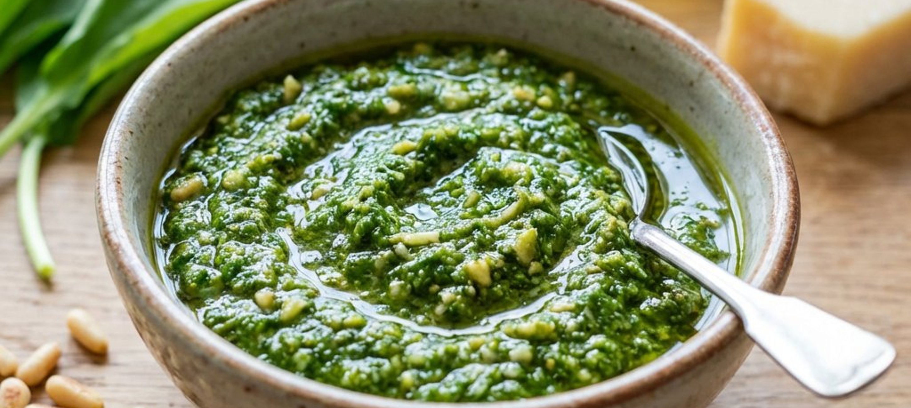 - 1Den Bärlauch gründlich waschen, trocken tupfen und grob zerkleinern. Die Pinienkerne in einer Pfanne ohne Fett goldbraun rösten und abkühlen lassen.