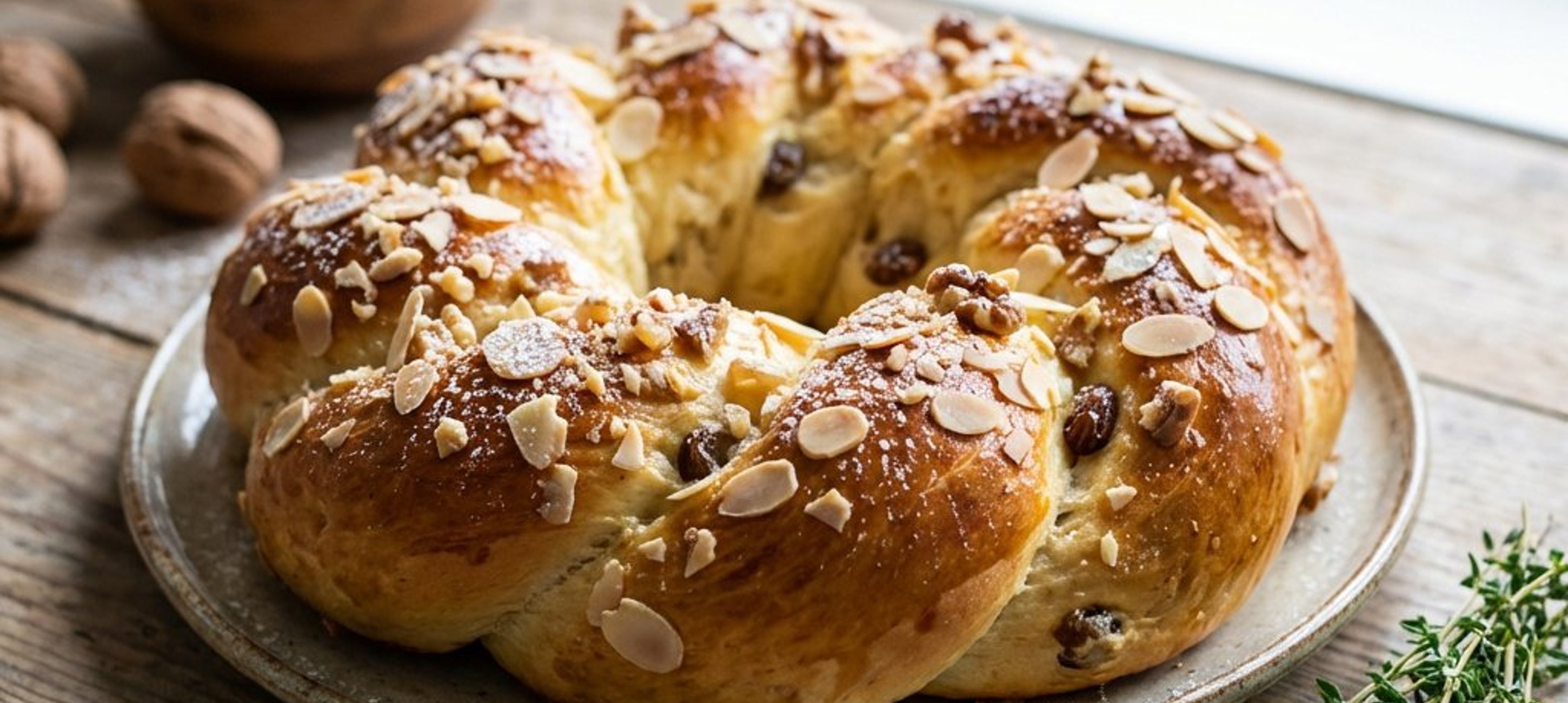 - 10Den Kranz mit dem restlichen Eiklar bestreichen und großzügig mit Mandelblättchen und gehackten Walnüssen bestreuen.
