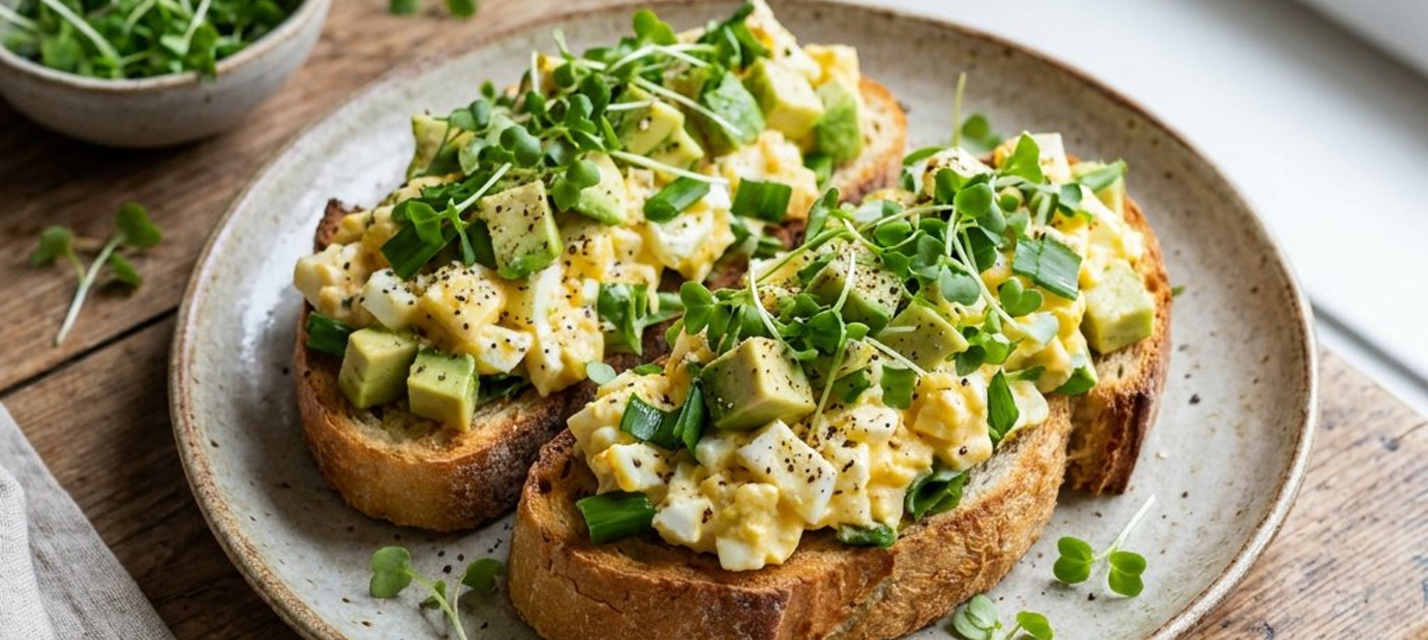 - 6Das Baguette in Scheiben schneiden und knusprig rösten. Mit dem aromatisierten Olivenöl beträufeln und den frischen Eiersalat darauf anrichten. Mit Microgreens garnieren und servieren.