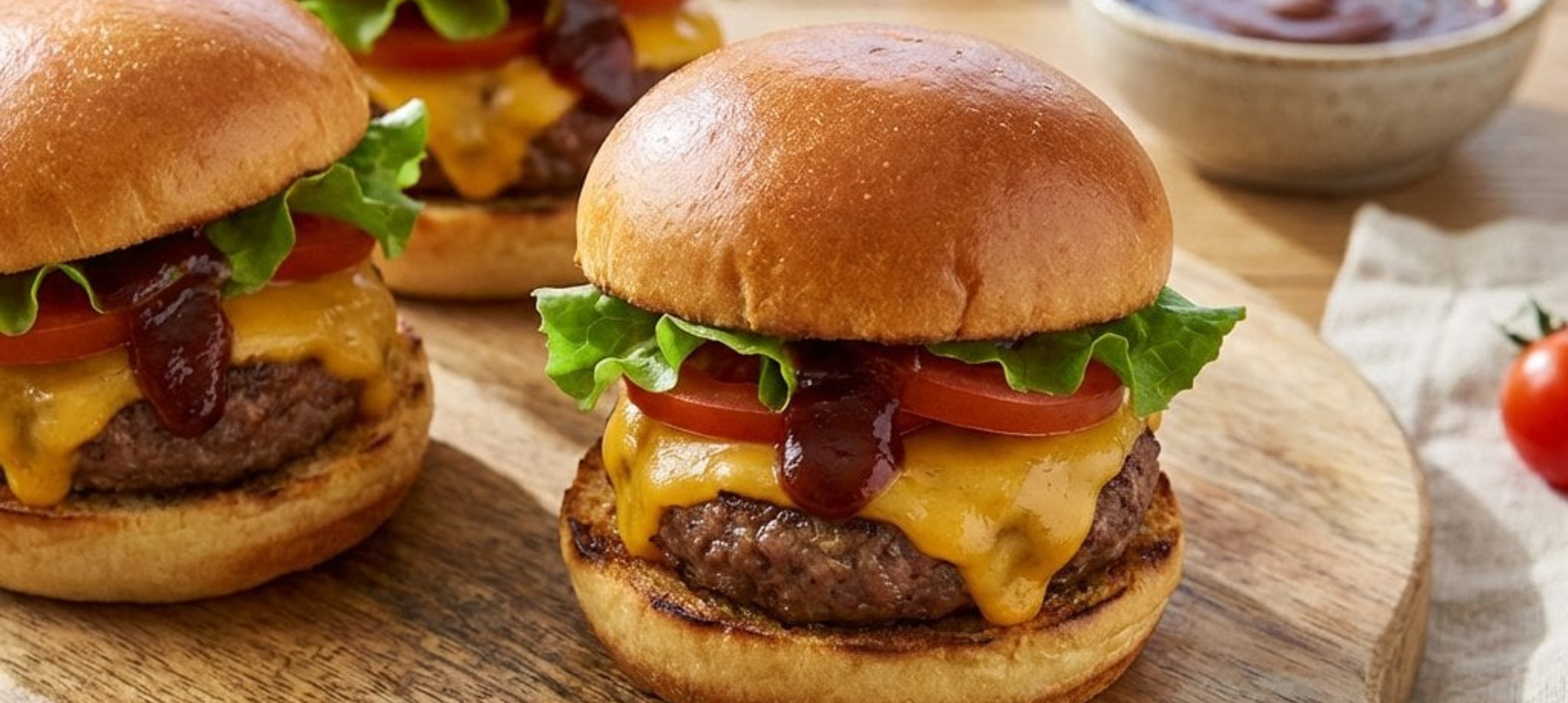 - 2In der Zwischenzeit die Mini Burger Buns aufschneiden und nach Belieben kurz anrösten. Die Unterseiten der Buns großzügig mit BBQ-Sauce bestreichen. Nun nacheinander ein Blatt Romana Salat, das Fleisch mit dem geschmolzenen Käse und eine Scheibe Paradeiser darauf platzieren. Mit der oberen Bun-Hälfte abschließen und sofort servieren.