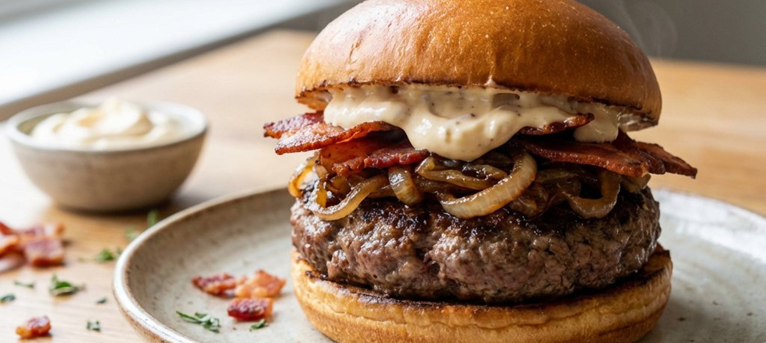 - 2Die Unterseite der Buns mit der Räuchermayonnaise bestreichen. Nacheinander Rucola, Fleisch, karamellisierte Zwiebeln, Speck und eine Tomatenscheibe daraufschichten. Mit der Oberseite des Buns abdecken und sofort servieren.