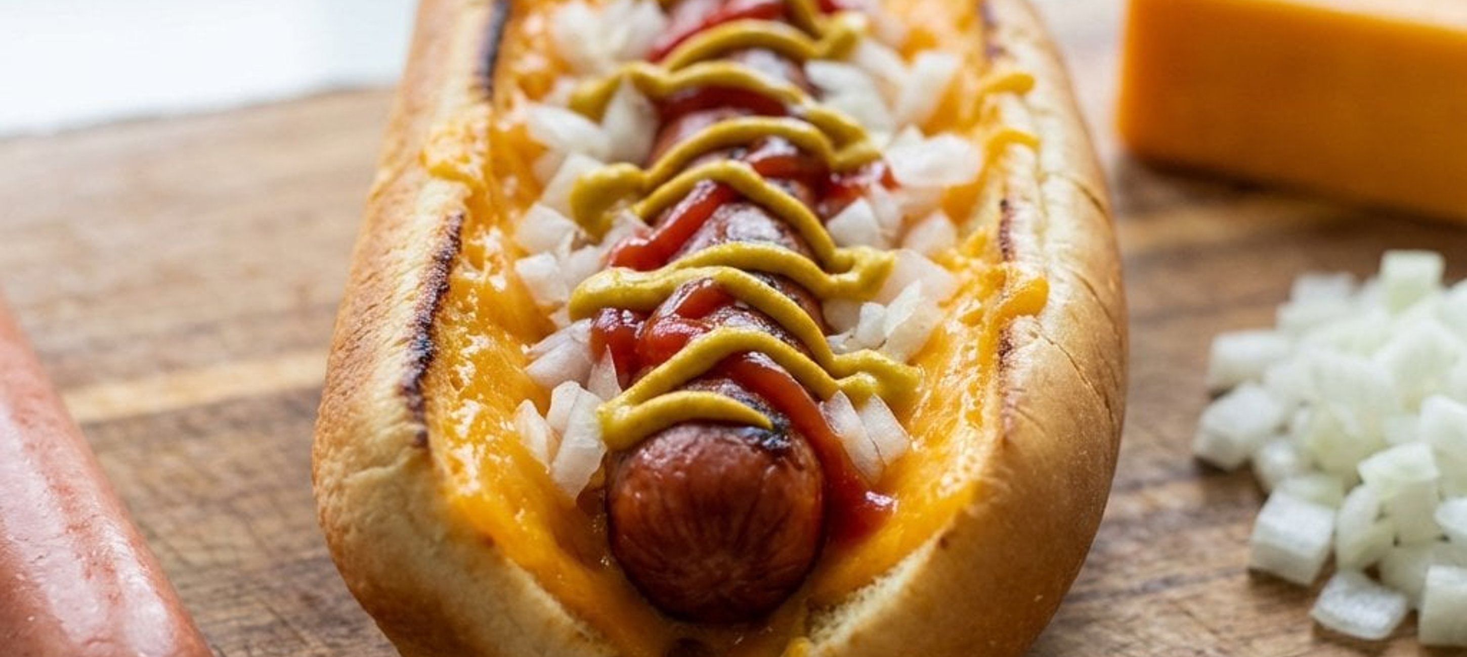 - 4Die fertigen Würstel in die Brötchen legen. Großzügig mit dem geriebenen Cheddar und den Zwiebelwürfeln bestreuen. Nach Belieben Ketchup und Senf hinzufügen.