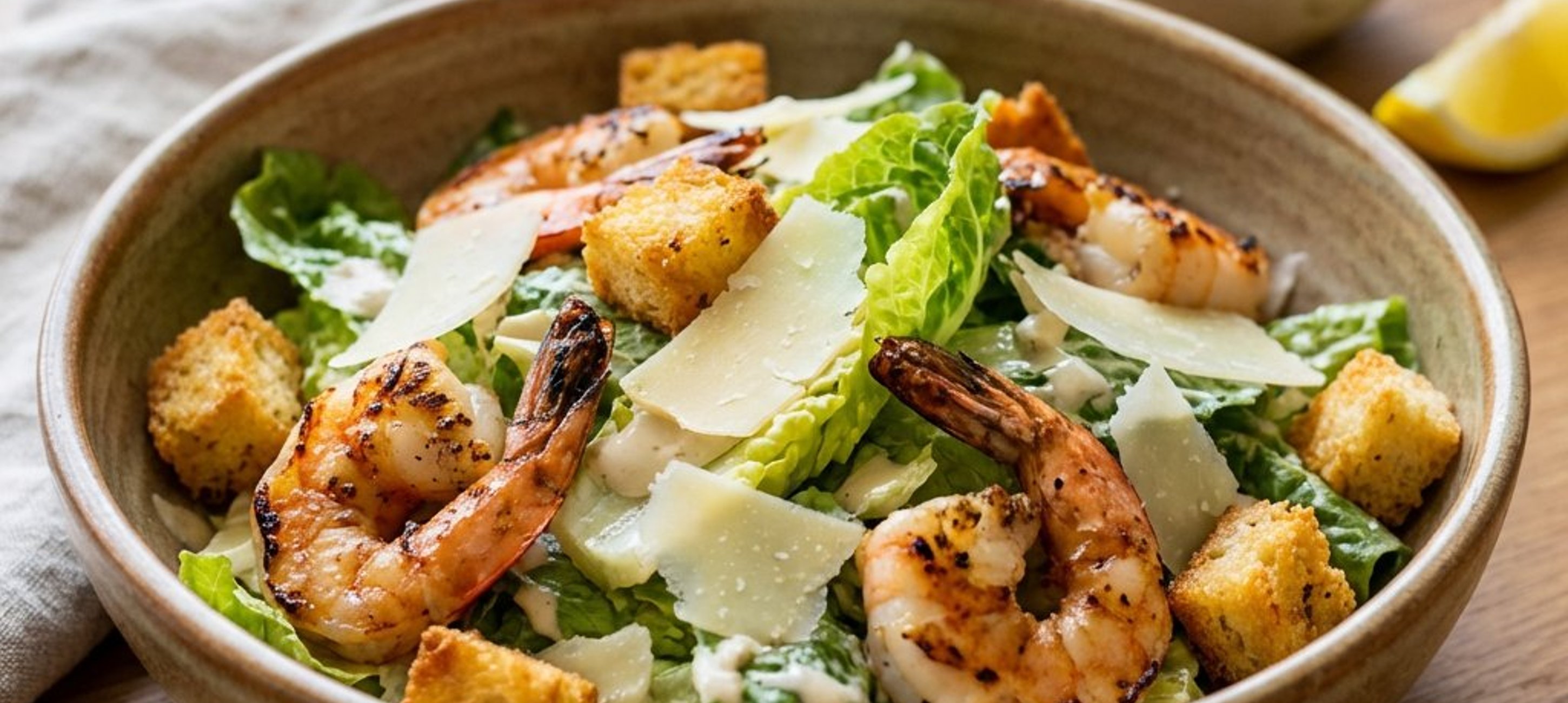 - 1Den Romanasalat in mundgerechte Stücke zupfen und mit dem Dressing vermengen. Den Salat auf Tellern anrichten, die gebratenen Garnelen und die knusprigen Croutons darauf verteilen. Mit dem restlichen Parmesan (gehobelt) bestreuen und servieren.