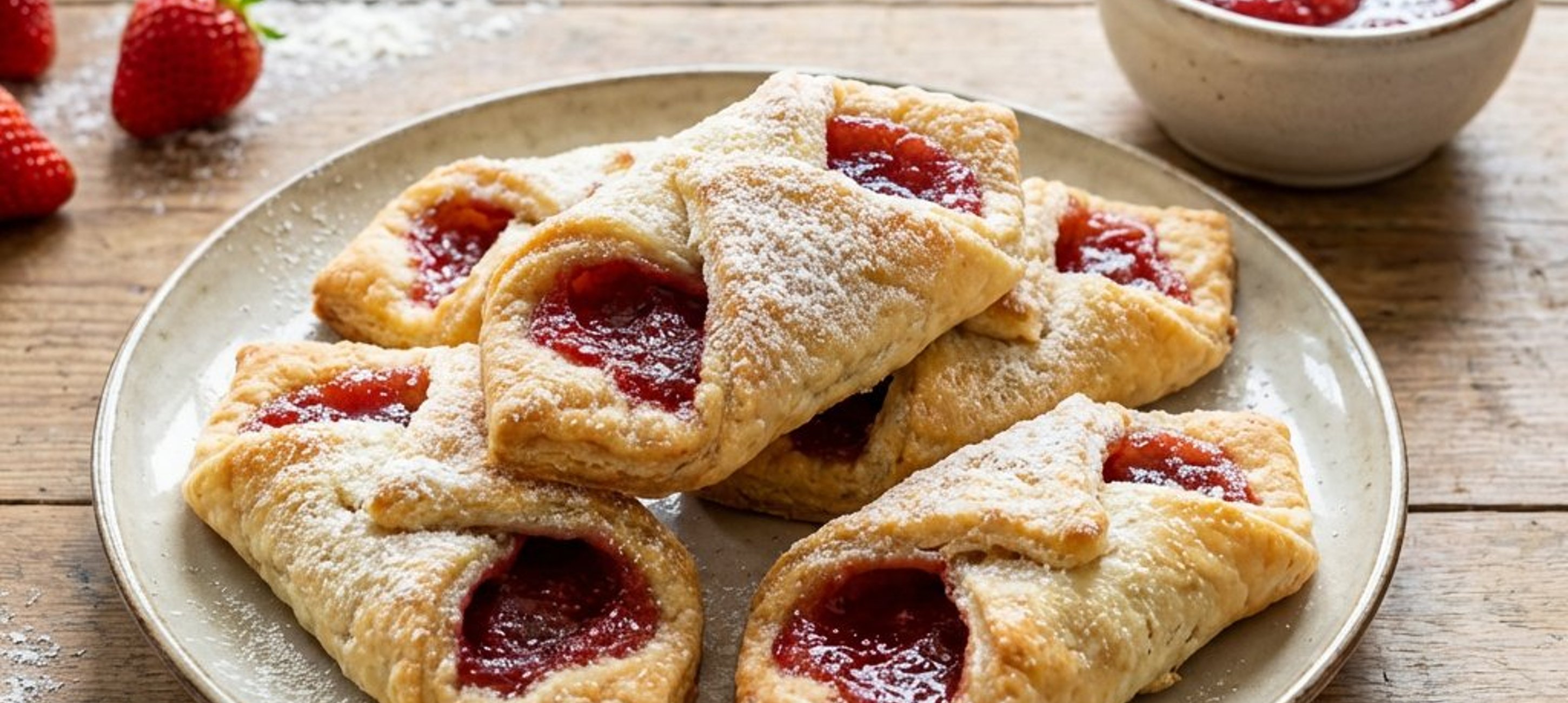 Servieren Sie die Tascherl am besten noch lauwarm – so kommt das Aroma der Erdbeeren und die Zartheit des Topfenteigs am besten zur Geltung. Ein Klecks Schlagobers passt hervorragend dazu!