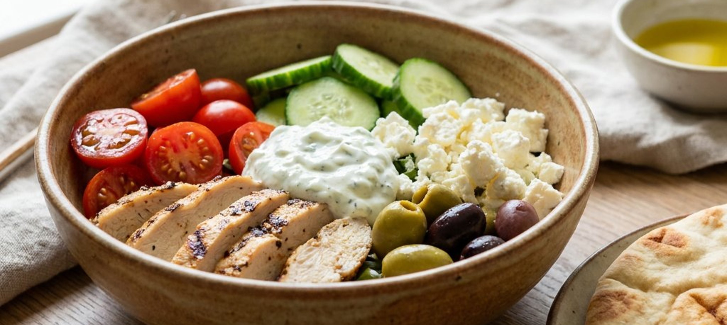 Serviere die Bowl mit extra Zitronenspalten für noch mehr Frische! Das Pitabrot schmeckt am besten, wenn es kurz auf dem Grill oder in der Pfanne angeröstet wird.