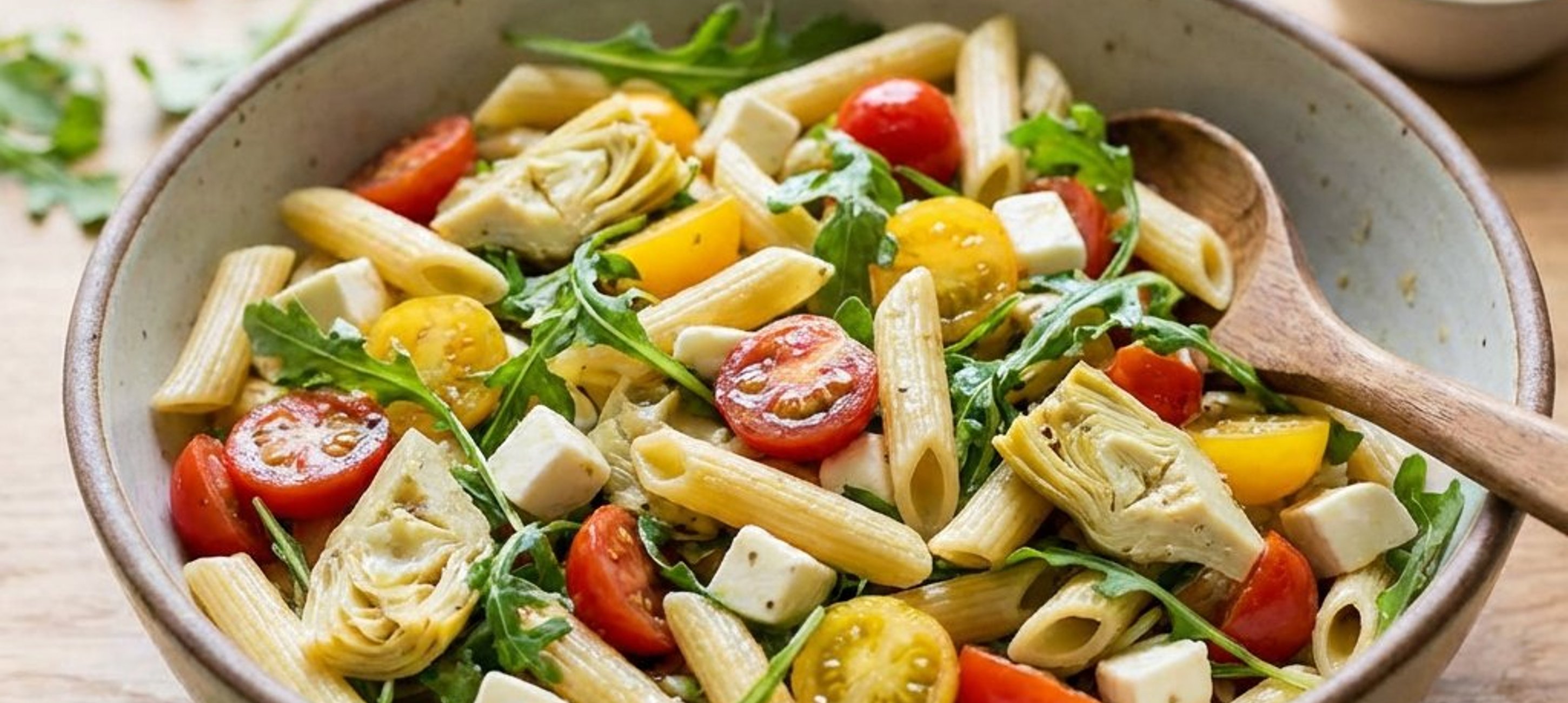 - 2In der Zwischenzeit die Kirschtomaten waschen und halbieren. Die Champignons putzen und in feine Scheiben schneiden. Den Rucola waschen und trocken schütteln. Die eingelegten Artischocken und Paprika in mundgerechte Stücke schneiden, die Oliven in Ringe schneiden. Den Mozzarella gut abtropfen lassen und in kleine Würfel schneiden. Alle vorbereiteten Zutaten (außer dem Rucola) in einer großen Schüssel mit den Nudeln vermengen.