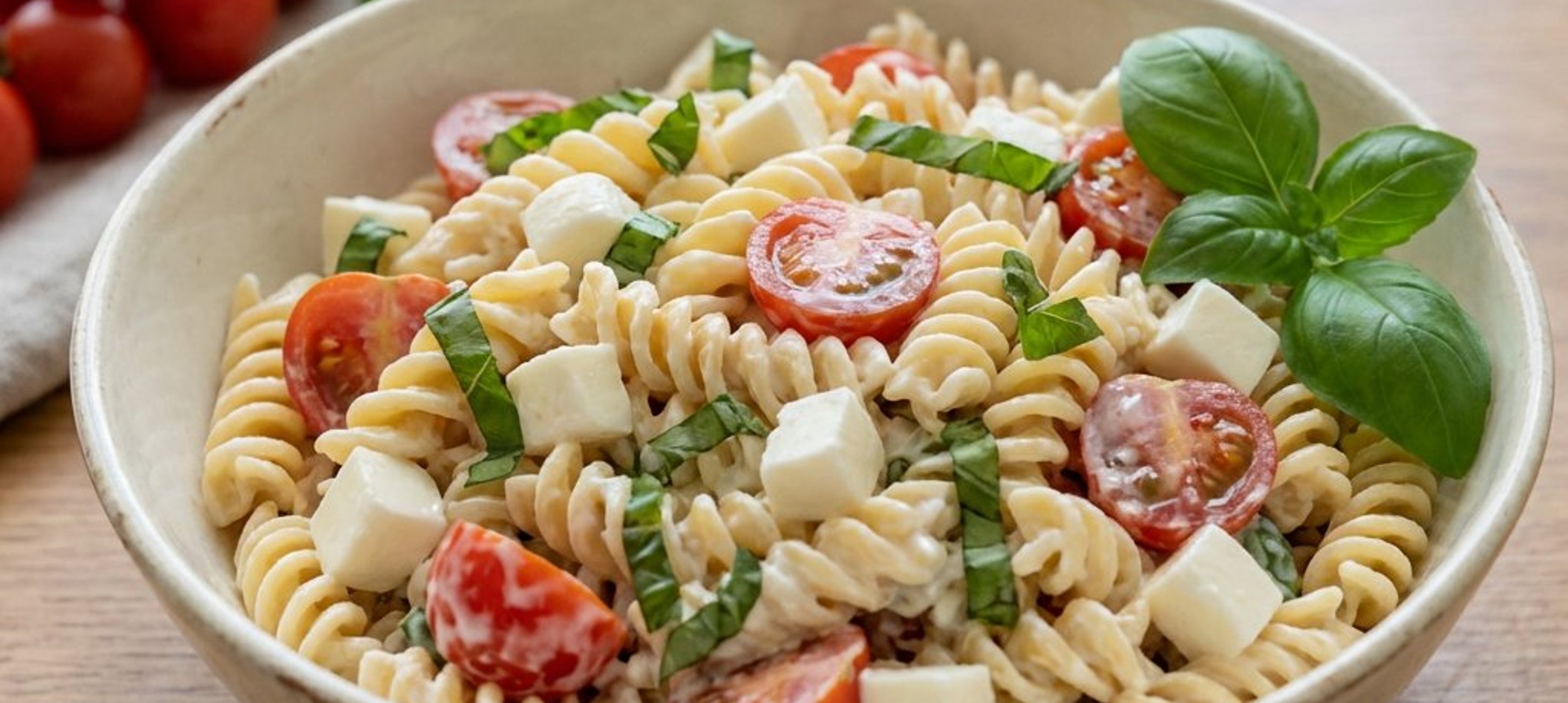 - 1In einem großen Topf ca. 2 Liter Wasser für die Pasta zum Kochen bringen. In der Zwischenzeit die Kirschtomaten waschen und halbieren. Den Mozzarella in mundgerechte Würfel schneiden und das Basilikum grob hacken. Alles zusammen in eine große Schüssel geben.