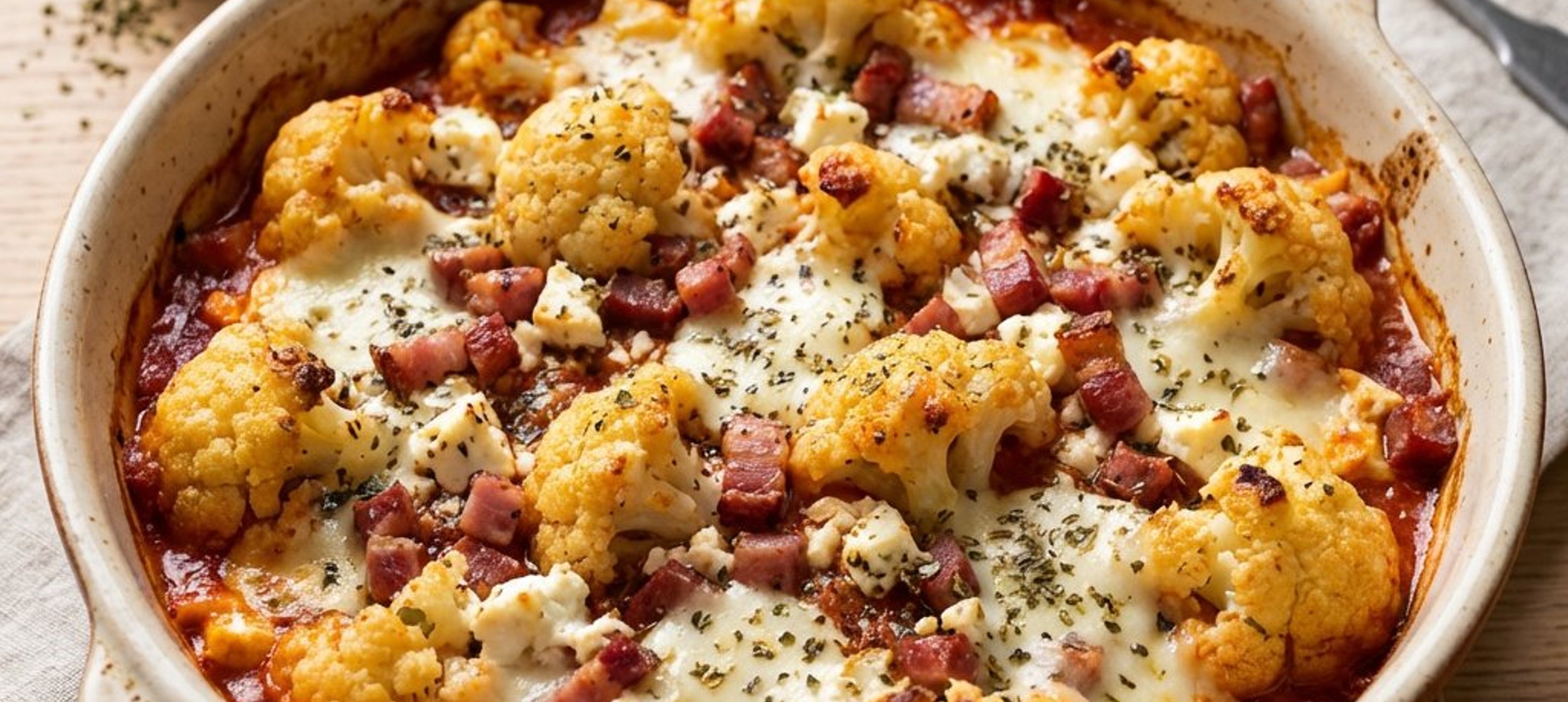 - 5Geben Sie die Karfiolmischung in die Auflaufform zum ausgelassenen Speck, mischen Sie alles gut durch und backen Sie das Gericht für 16–17 Minuten bei 220–225 °C.