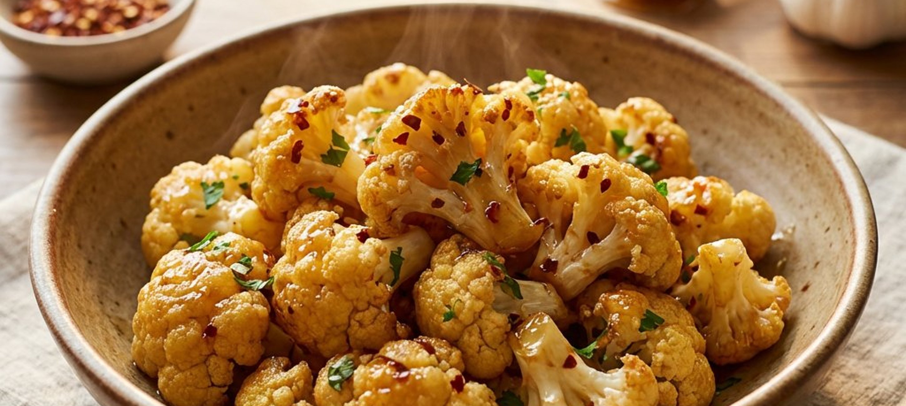 Servieren Sie den Karfiol mit einem Dip aus Sojasauce, frischem Ingwer, etwas Honig und einem Spritzer Essig für eine asiatische Note.