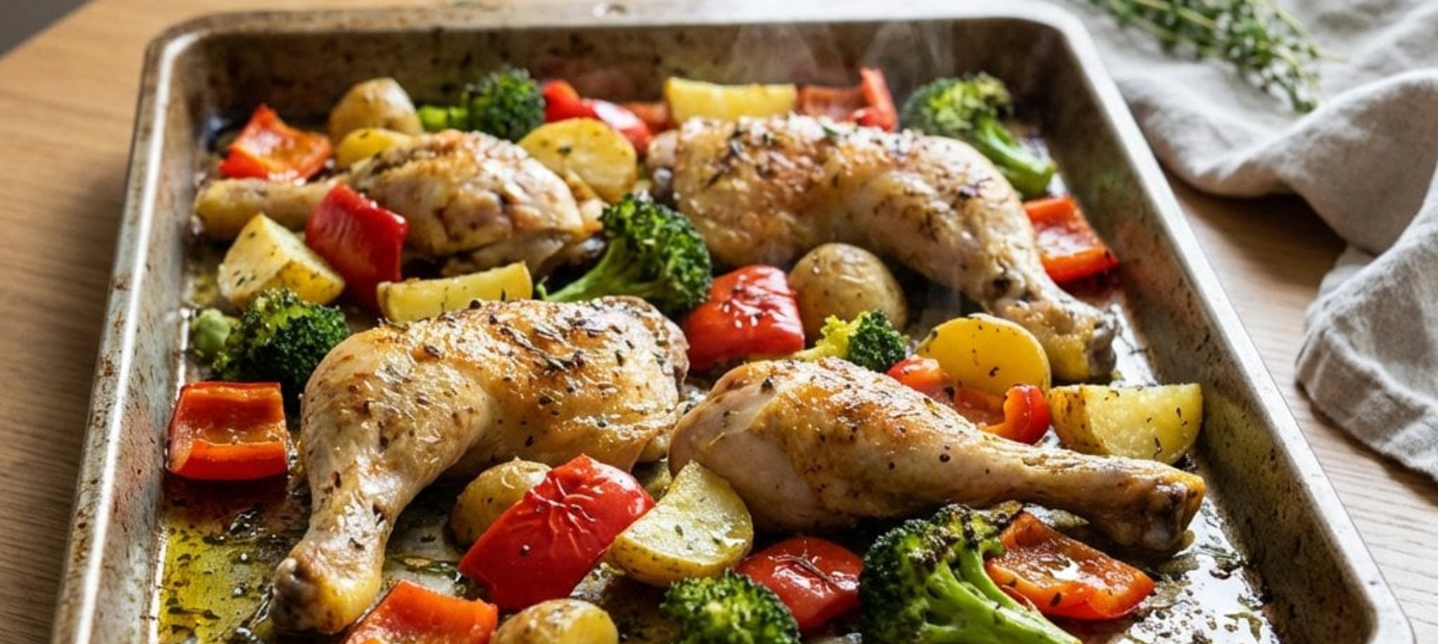 - 4Nach 15 Minuten das Blech aus dem Ofen nehmen. Das vorbereitete Gemüse (Zwiebel, Paprika) zu den Erdäpfeln geben. Die Knoblauchhälften mit der Schnittfläche nach unten auf das Blech legen. Alles leicht salzen, mit dem restlichen Rapsöl (1 EL) beträufeln und die Hendlstücke obenauf verteilen. Zurück in den Ofen schieben und weitere 30–40 Minuten bei 190–200 °C garen.