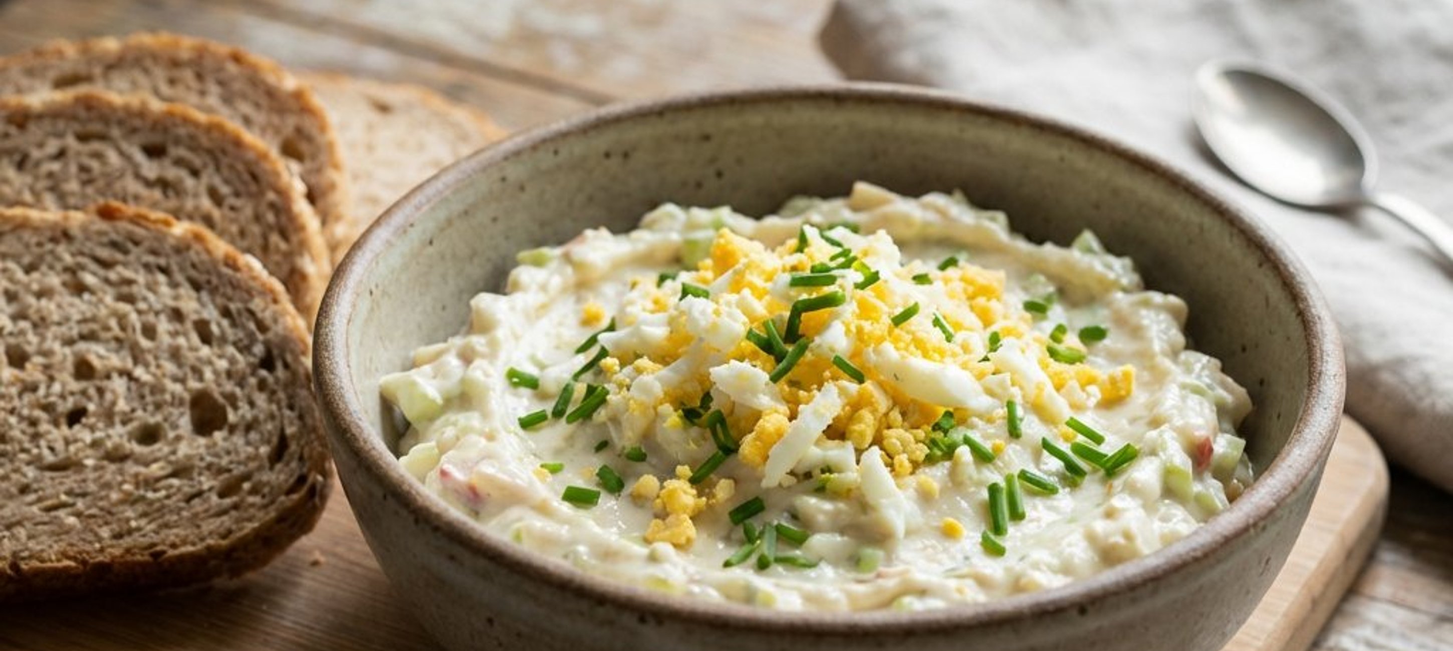- 3In einer mittelgroßen Schüssel den geriebenen Sellerie, Apfel, die geriebenen Eier, Frischkäse und Dijonsenf gut miteinander vermengen. Den Aufstrich mit Salz und Pfeffer abschmecken.