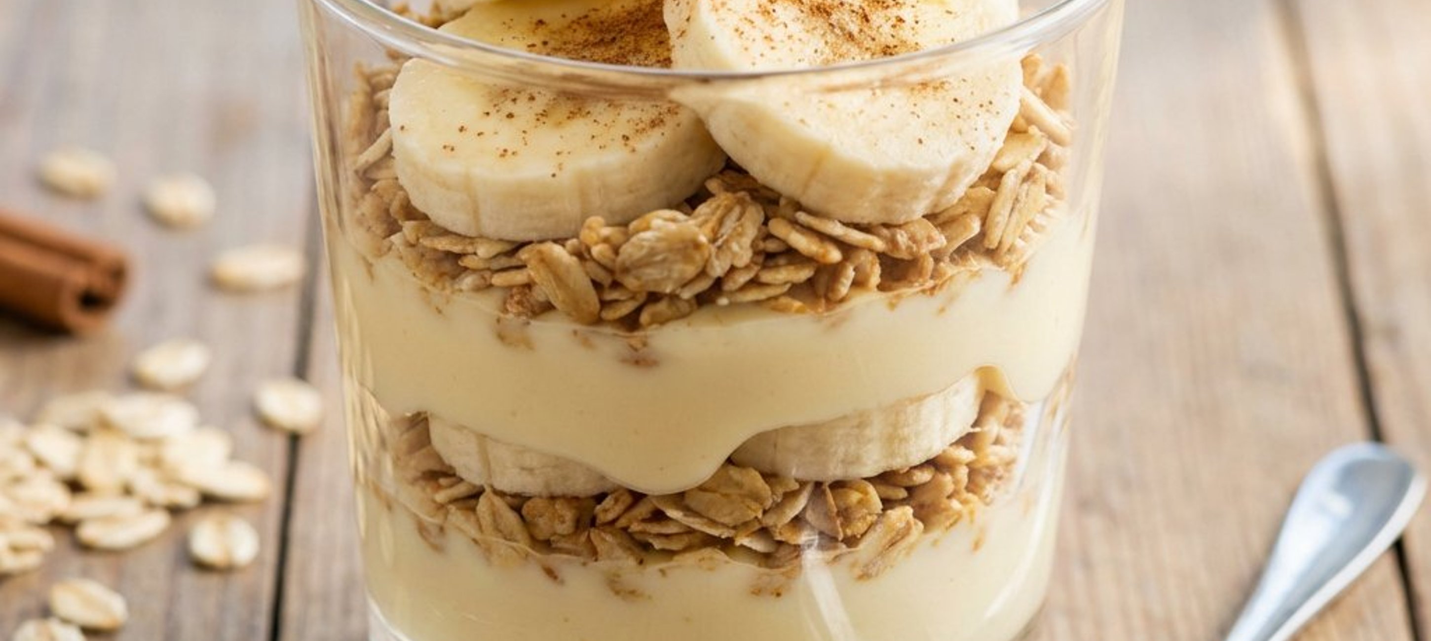 - 3Den abgekühlten Pudding aus dem Kühlschrank nehmen, die Folie entfernen und nochmals kurz mit dem Schneebesen aufschlagen. Die Hälfte des Puddings in die Gläser über die Haferflocken füllen. Darauf die Hälfte der Bananenscheiben verteilen. Den restlichen Pudding darübergeben und mit den restlichen Bananenscheiben abschließen.