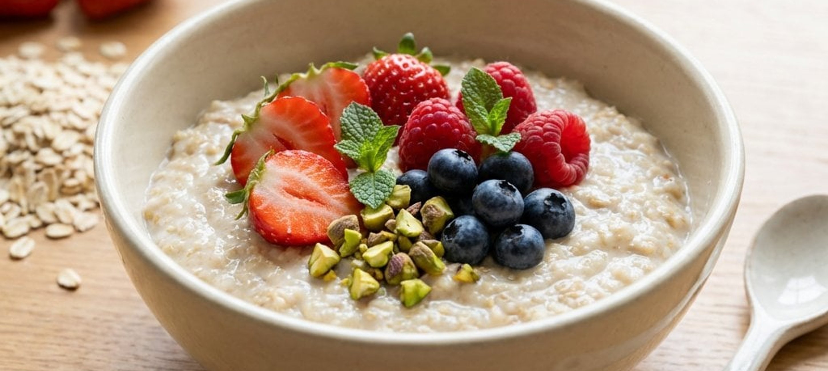- 3Verteilen Sie den warmen Haferbrei auf zwei Schüsseln. Garnieren Sie jede Portion großzügig mit den frischen Erdbeeren, Himbeeren und Heidelbeeren. Streuen Sie die grob gehackten Pistazien darüber und verfeinern Sie das Ganze mit ein paar frischen Minzblättern. Sofort genießen!