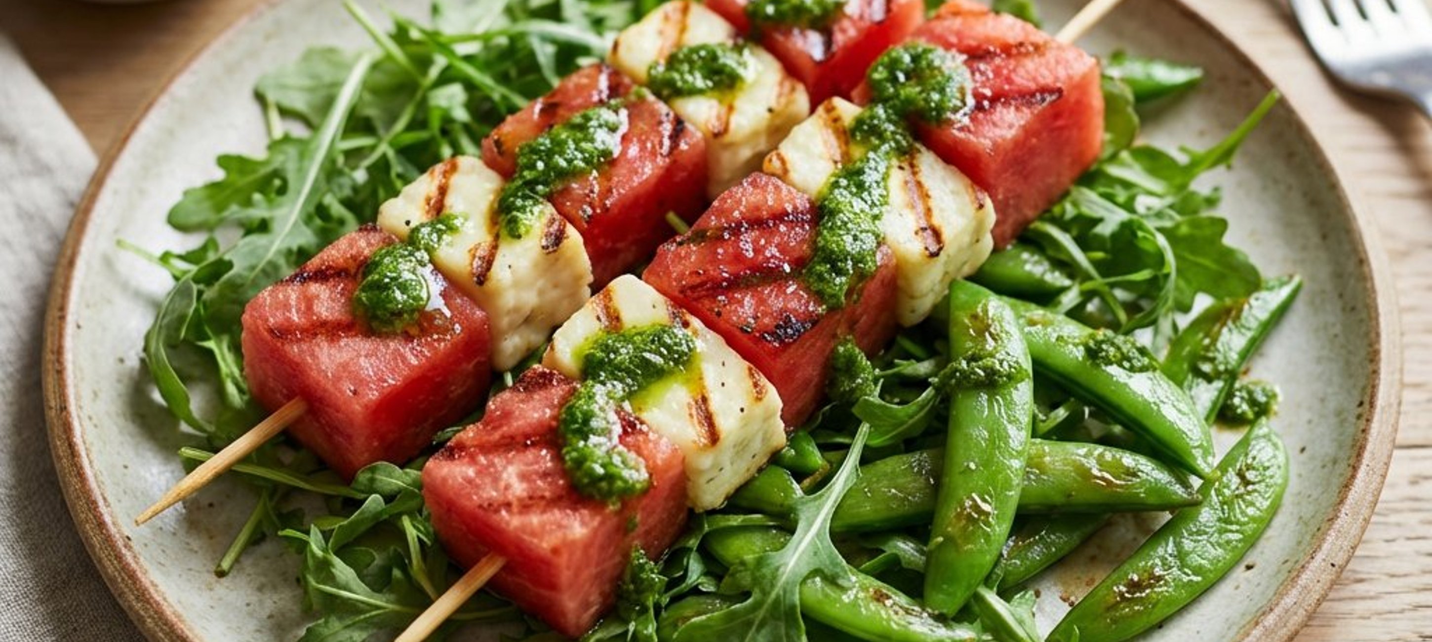 - 4Den Rucola auf Tellern anrichten. Die gegrillten Melonen-Halloumi-Spieße und die gerösteten Zuckerschoten darauf platzieren. Alles großzügig mit dem Basilikum-Dressing beträufeln und sofort servieren.