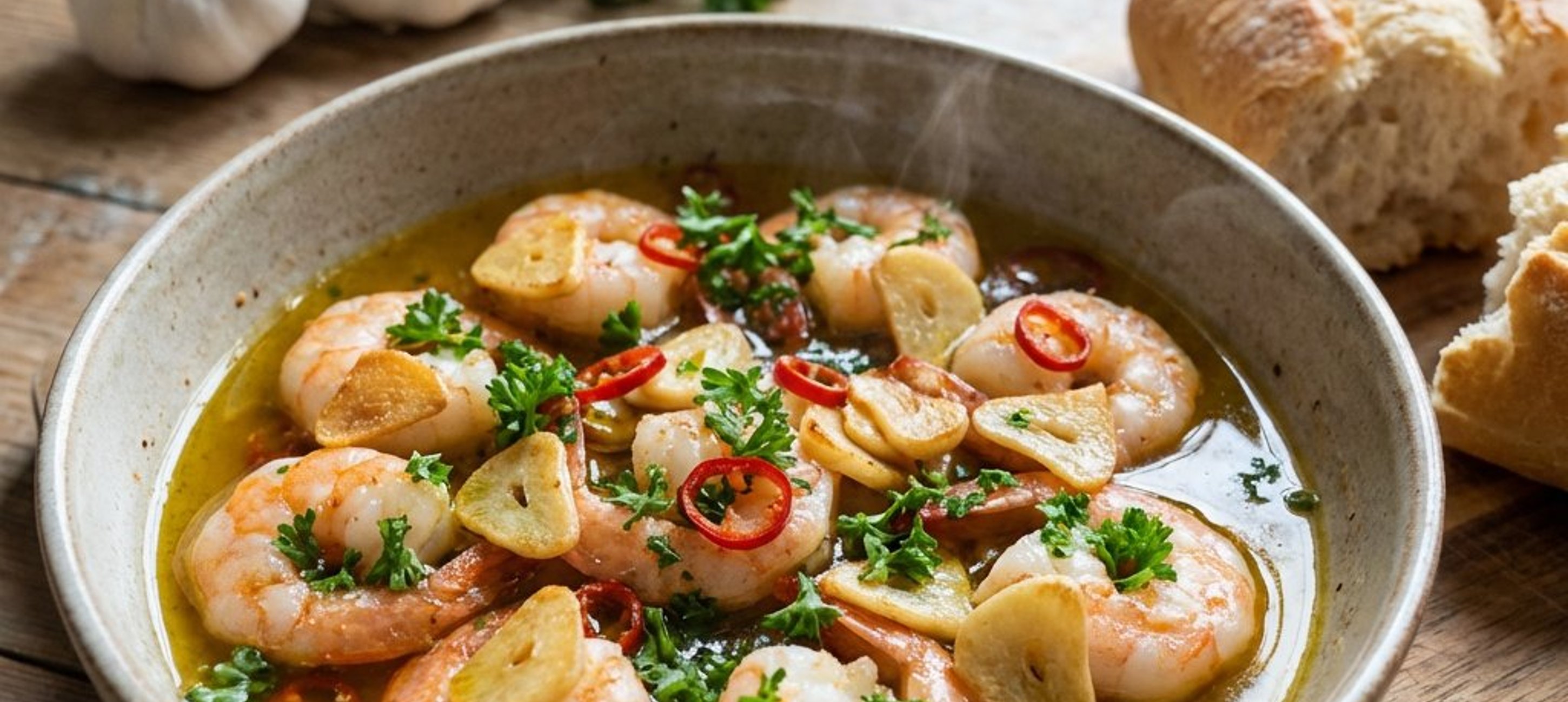 Servieren Sie die Garnelen in einer traditionellen Tonschale (Cazuela), um die Hitze optimal zu speichern. Ein knuspriges Baguette ist ein Muss, um das aromatische Öl aufzutunken!