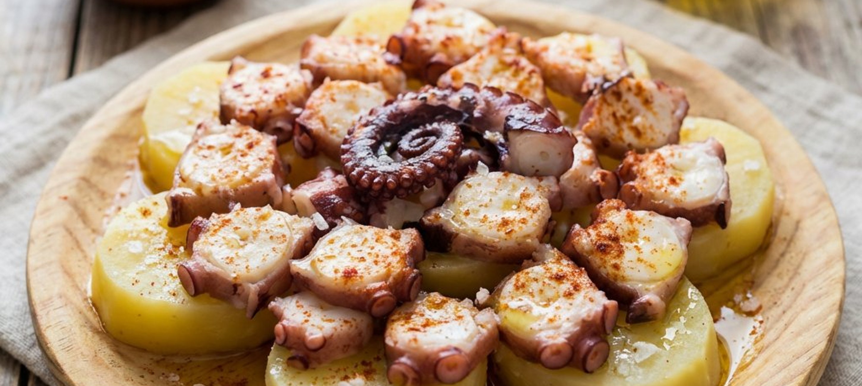 - 4Die Oktopusstücke gleichmäßig auf den Erdäpfeln verteilen.