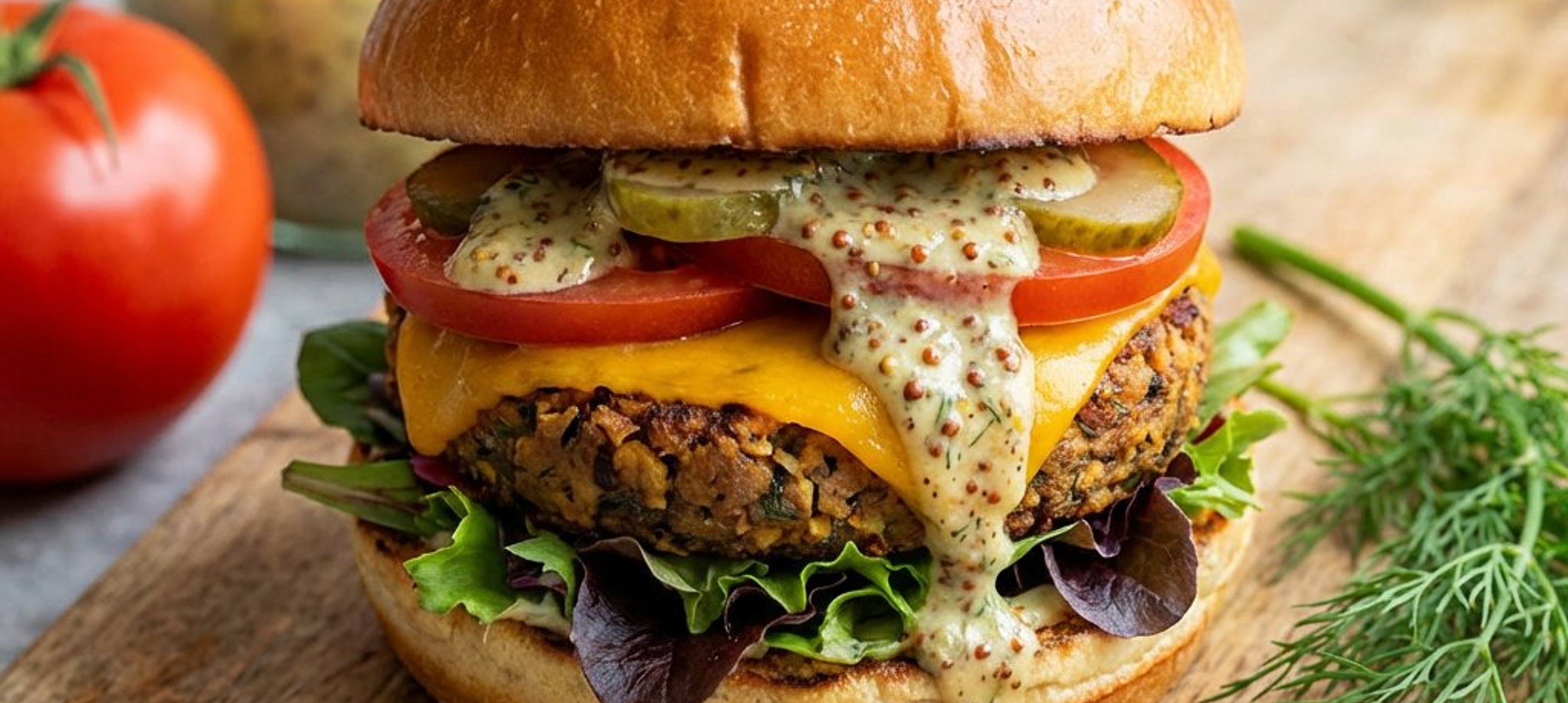 - 1Die Burgerbrötchen aufschneiden und die Schnittflächen kurz ohne Fett anrösten. Die Unterseiten mit Ketchup bestreichen. Mit Salatblättern belegen, darauf die Tomatenscheiben und das Burger Patty mit dem geschmolzenen Käse platzieren. Mit Essiggurken-Scheiben, fein gehackten Zwiebeln und einem großzügigen Löffel des Dill-Senf-Dressings garnieren. Den Deckel aufsetzen und sofort genießen. Guten Appetit!