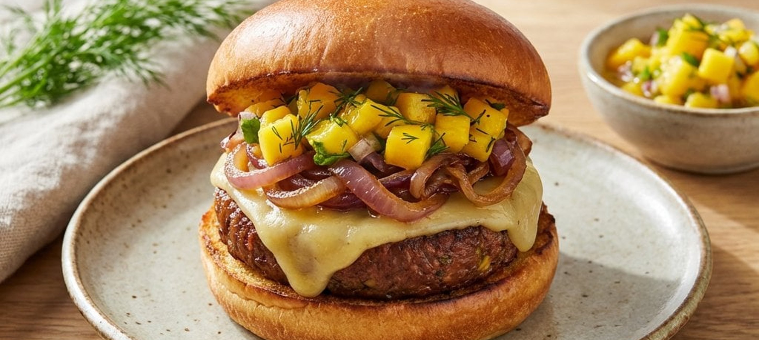 - 2Die veganen Burger Patties braten (ca. 2-3 Min. pro Seite). Die Burger Buns anrösten. Die Unterseite mit Dressing bestreichen, Salatblätter darauf verteilen und das Patty daraufsetzen. Mit karamellisierten Zwiebeln und Mangosalsa krönen. Deckel aufsetzen und mit Dill garnieren. Guten Appetit!