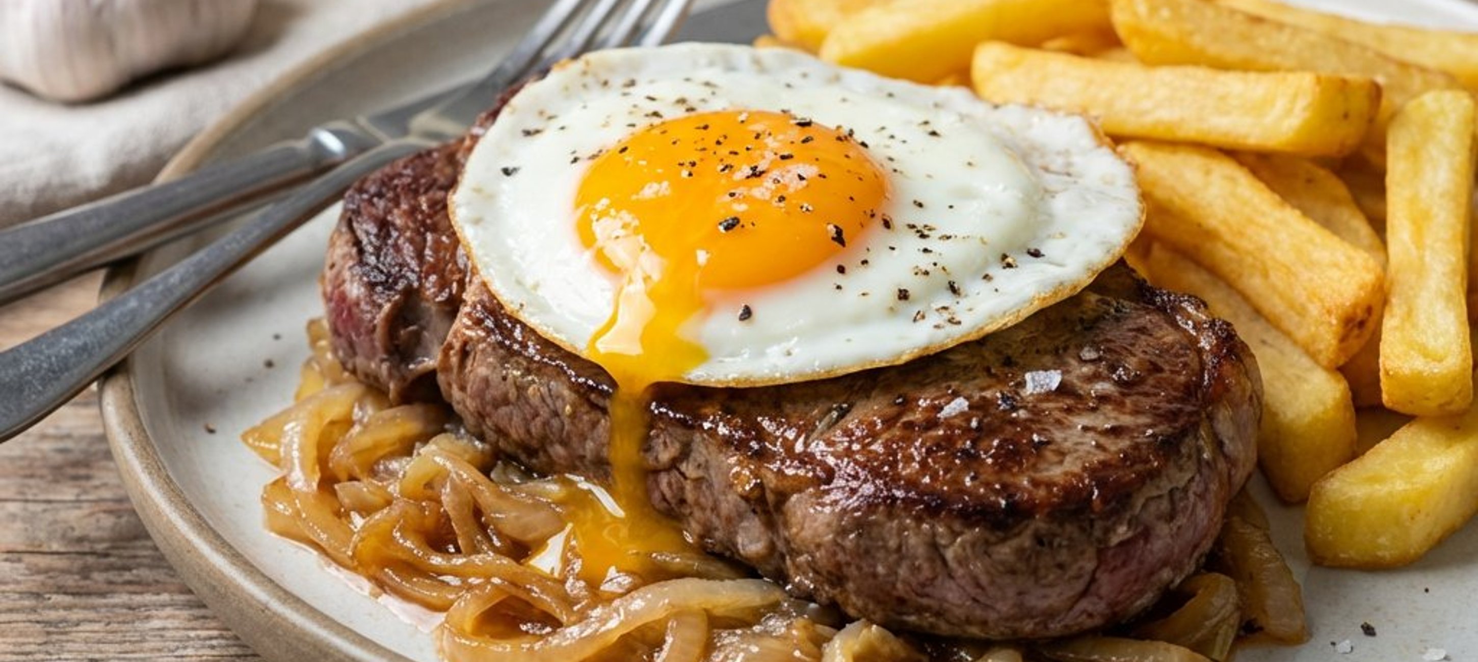 - 2Die Erdäpfel, das Steak mit den Zwiebeln und das Spiegelei auf Tellern anrichten und sofort servieren. Mahlzeit!