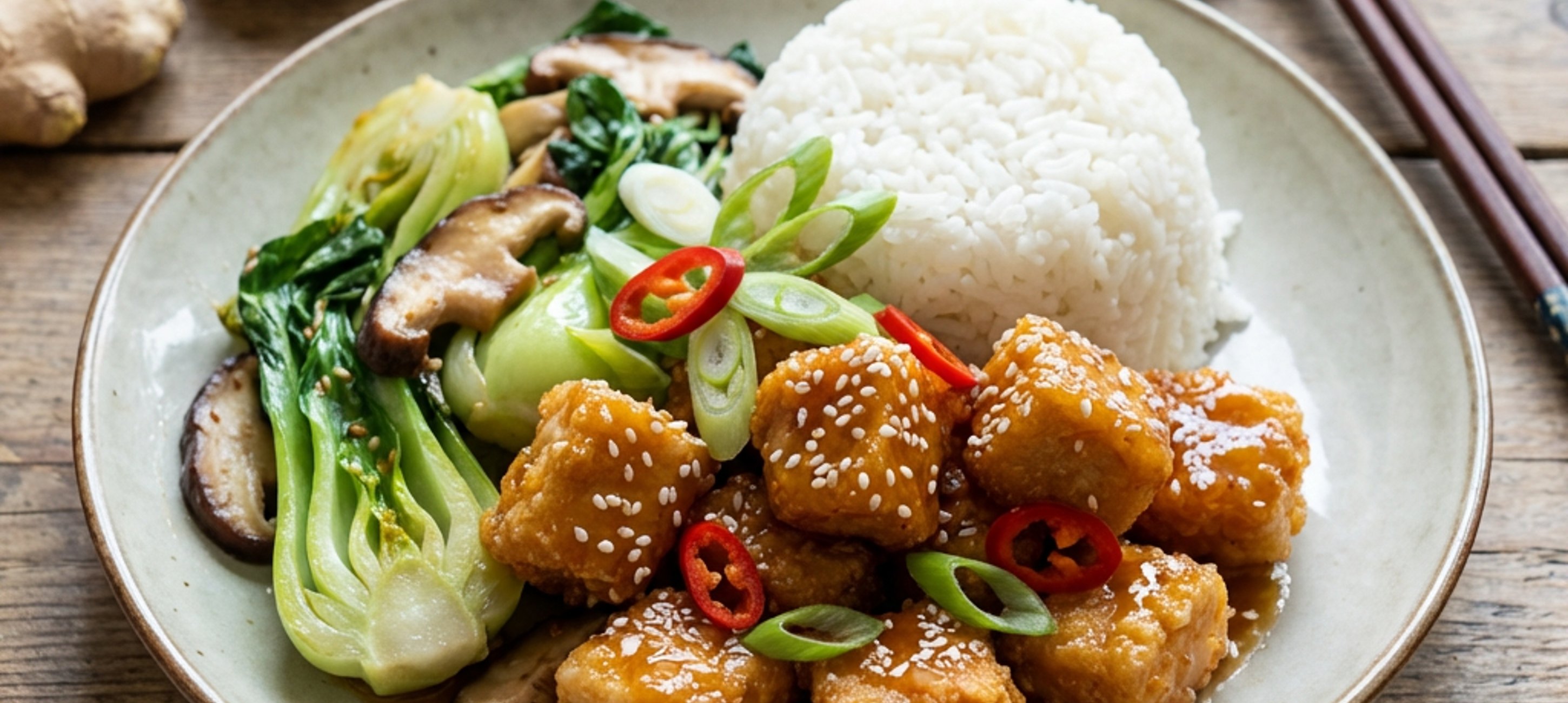 - 8Auf einem Teller Reis, Pak Choi und Hähnchen anrichten. Mit Frühlingszwiebeln und Sesam garnieren.