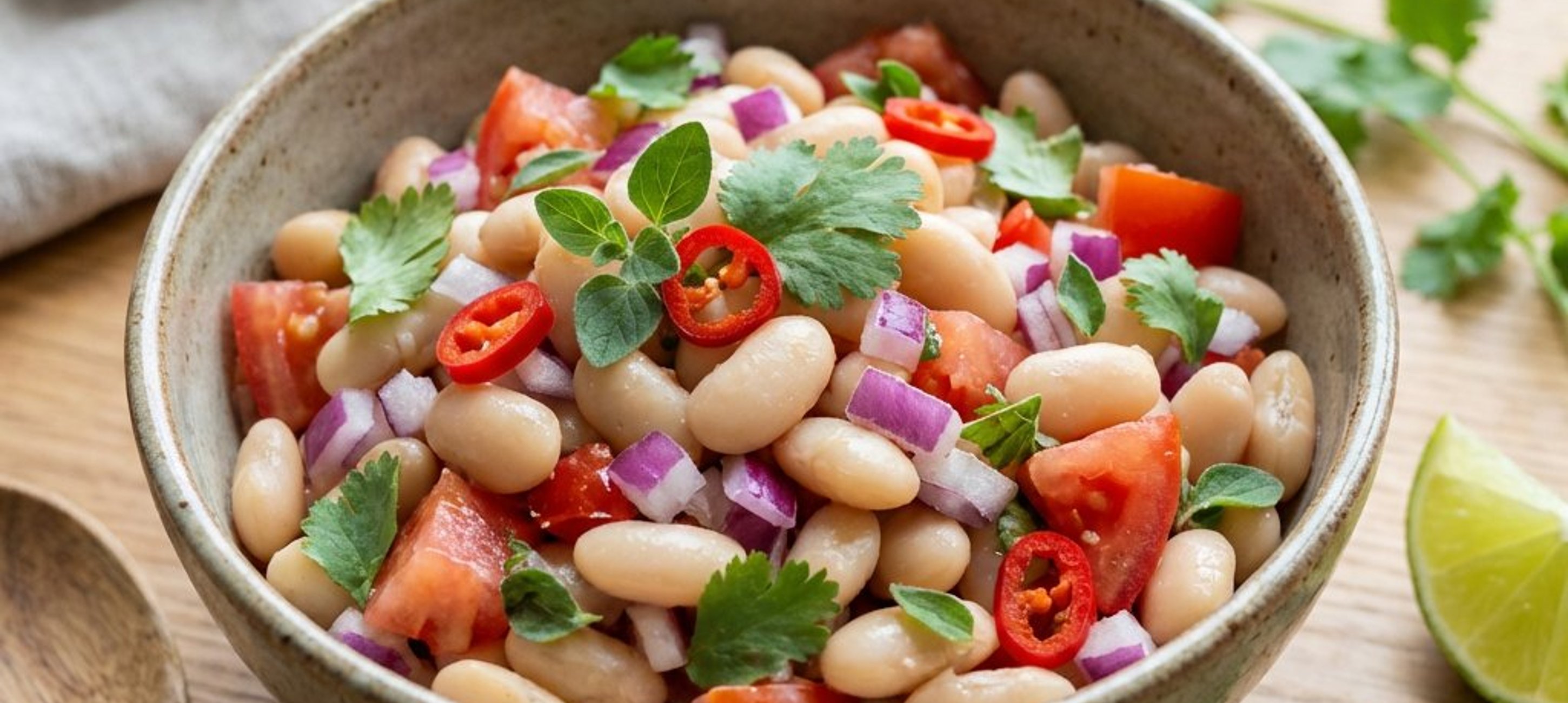 - 2Die weißen Bohnen abspülen, gut abtropfen lassen und zu dem Gemüse in die Schüssel geben. Die restlichen Zutaten wie Koriander und Oregano fein hacken und unterheben. Mit frisch gemahlenem Pfeffer, Limettensaft und Weißweinessig nach eigenem Geschmack abschmecken.
