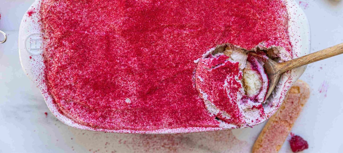 - 7Vor dem Servieren die restlichen gefriergetrockneten Himbeeren mahlen und das Tiramisu damit bestäuben.