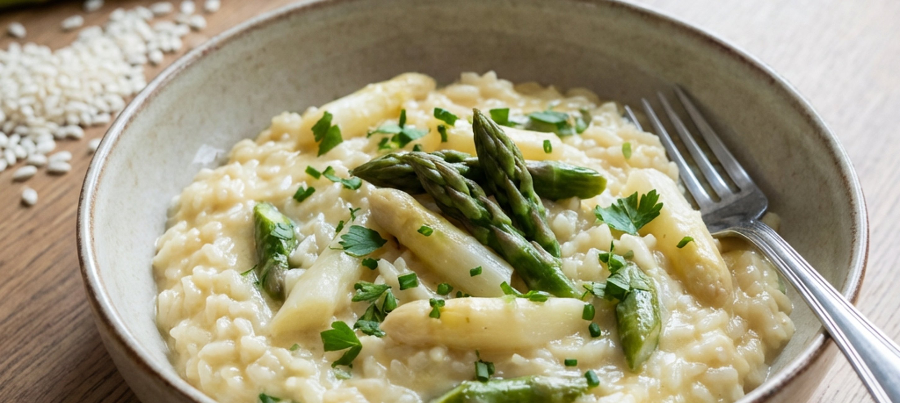 - 4Nach weiteren 5 Minuten die Spargelköpfe unterrühren. Das Risotto insgesamt ca. 18-20 Minuten garen, bis der Reis cremig, aber im Kern noch bissfest ist.