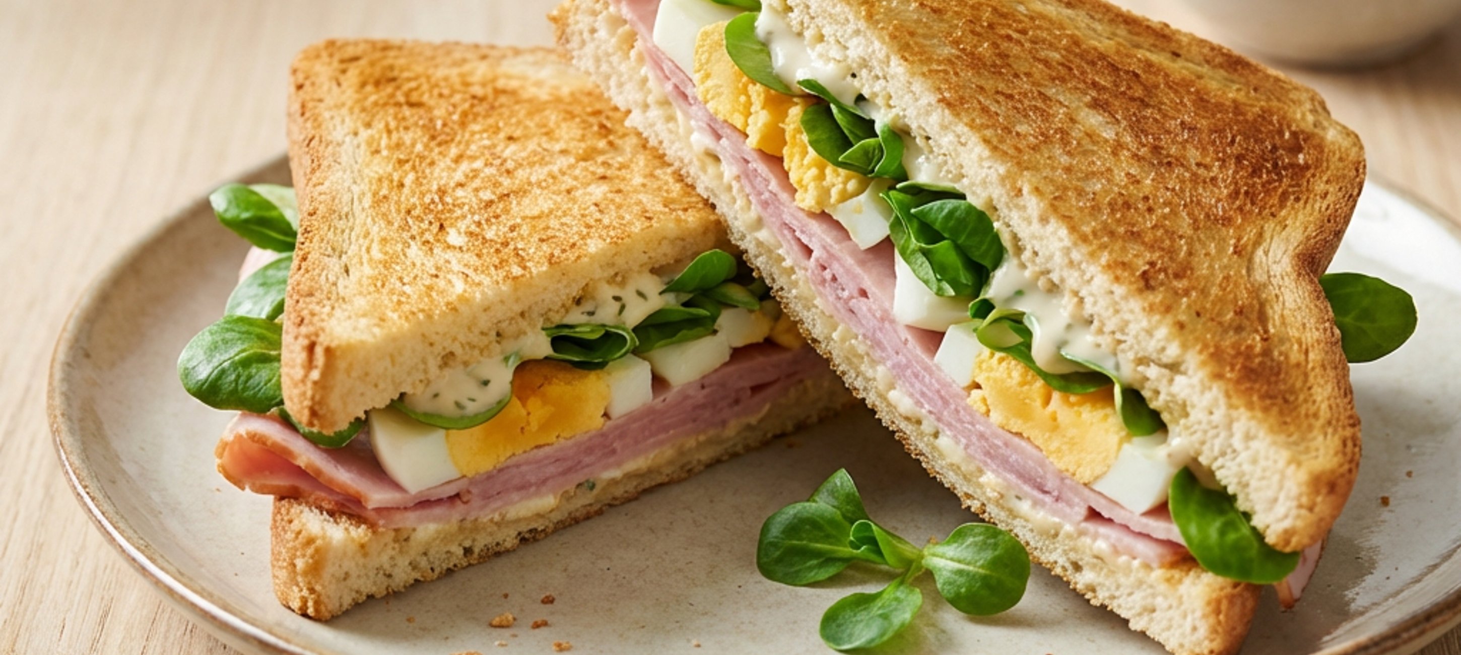 - 3Auf die untere Scheibe Salat, Schinkenscheiben und Eierscheiben schichten.