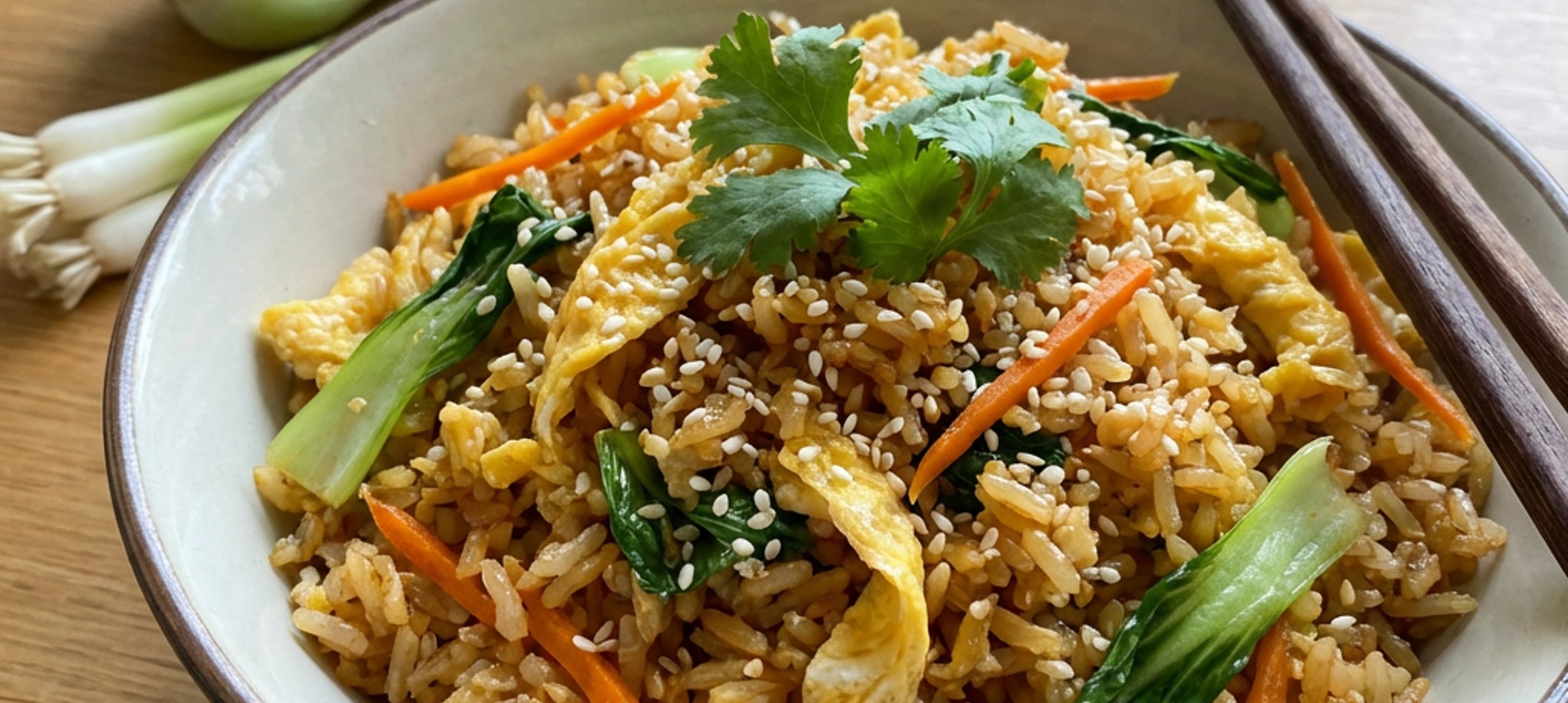 - 3Karotten, Pak Choi und Jungzwiebeln zum Schluss hinzufügen und für weitere 2 Minuten mitrösten. Mit einer Prise Salz und Pfeffer abschmecken. Den gebratenen Reis mit Sesamsamen und frischem Koriander garniert servieren.