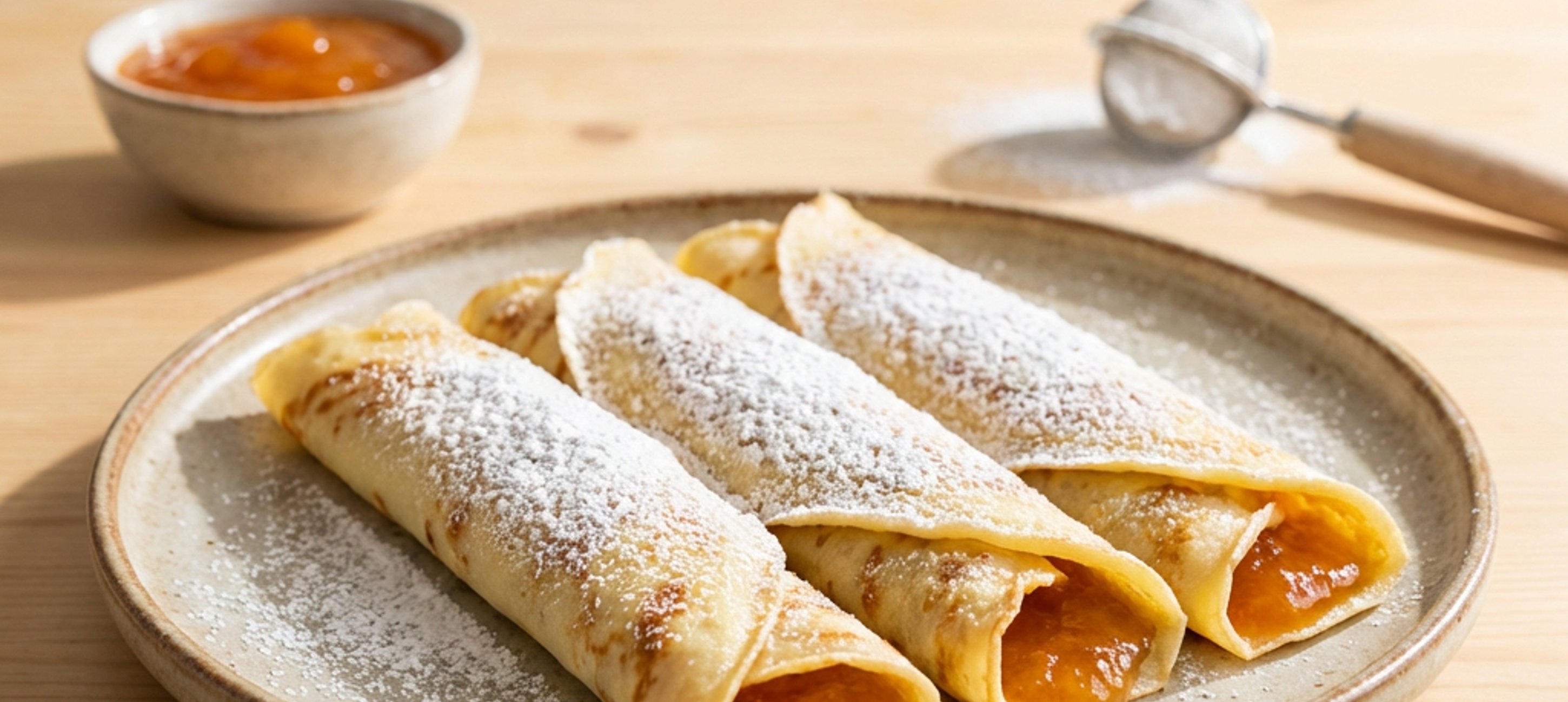 - 3Die fertigen Palatschinken auf einen Teller legen, großzügig mit Marillenmarmelade bestreichen, einrollen und mit Staubzucker bestreuen. Warm servieren.