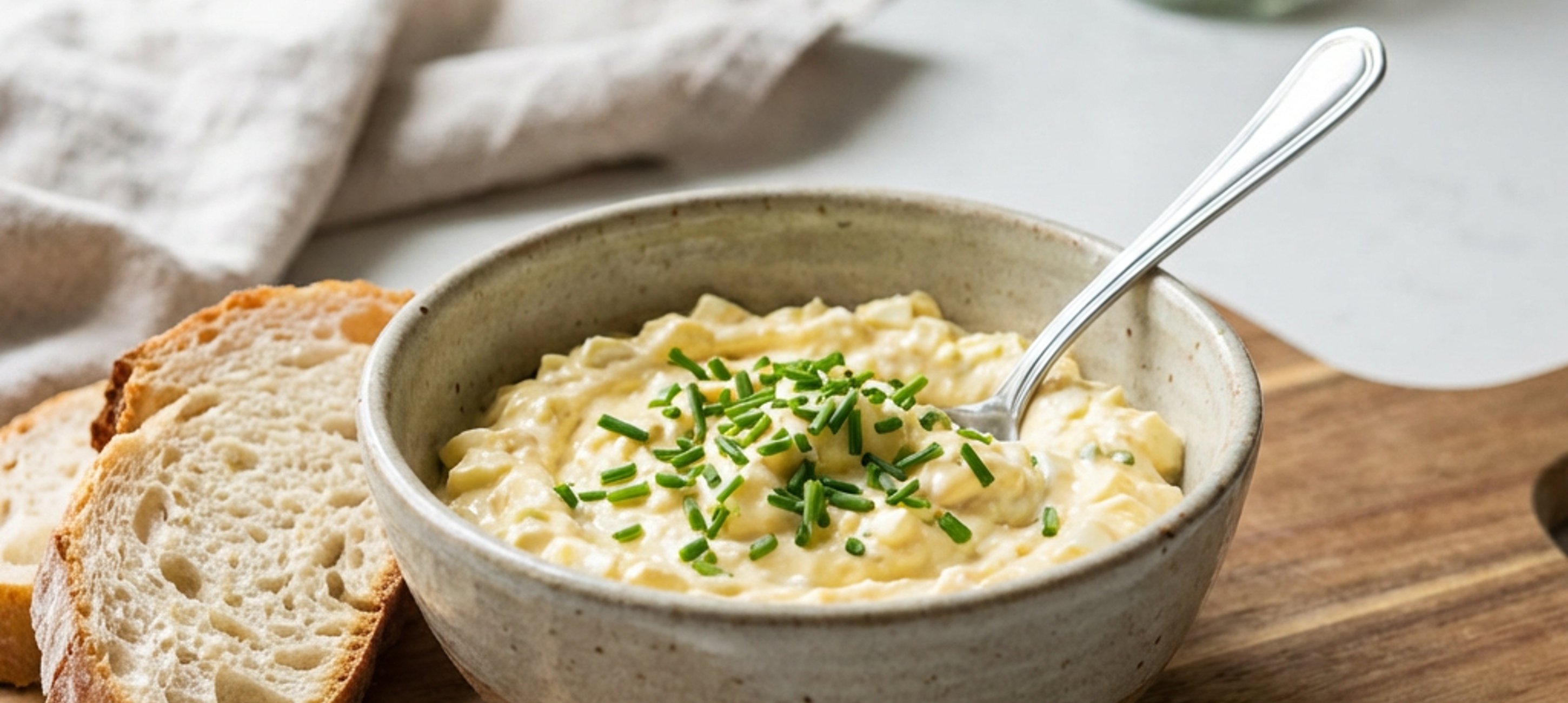 - 2Die Dotter mit einer Gabel fein zerdrücken. Frischkäse, Naturjoghurt, Senf, Salz und Pfeffer hinzufügen und alles zu einer glatten Masse verrühren.