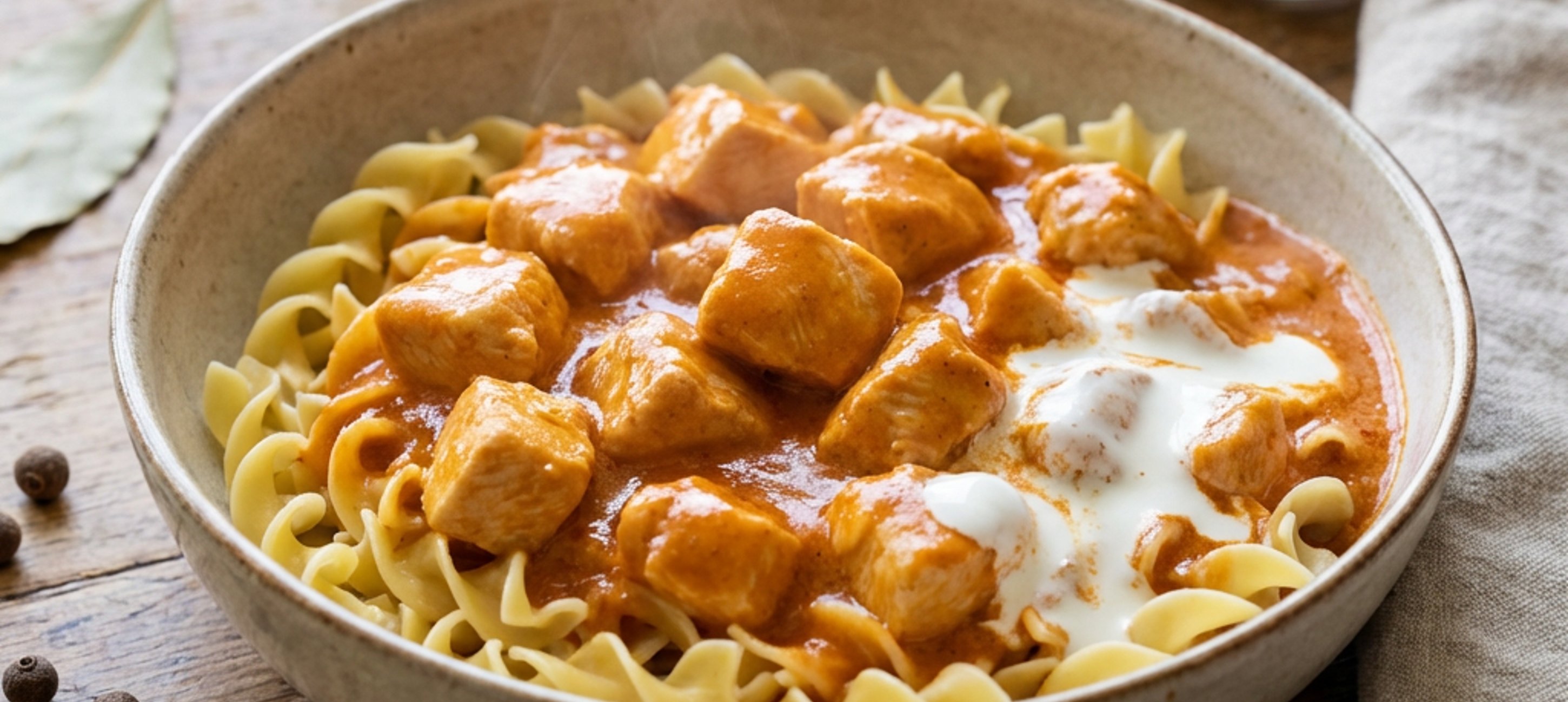 - 7Das fertige Hendl-Paprikasch nochmals mit Salz und Pfeffer abschmecken. Lorbeerblatt und Pimentkörner entfernen. Auf Tellern anrichten und am besten mit Nockerln, Spätzle oder Teigwaren servieren. Nach Belieben mit frischer Petersilie bestreuen.
