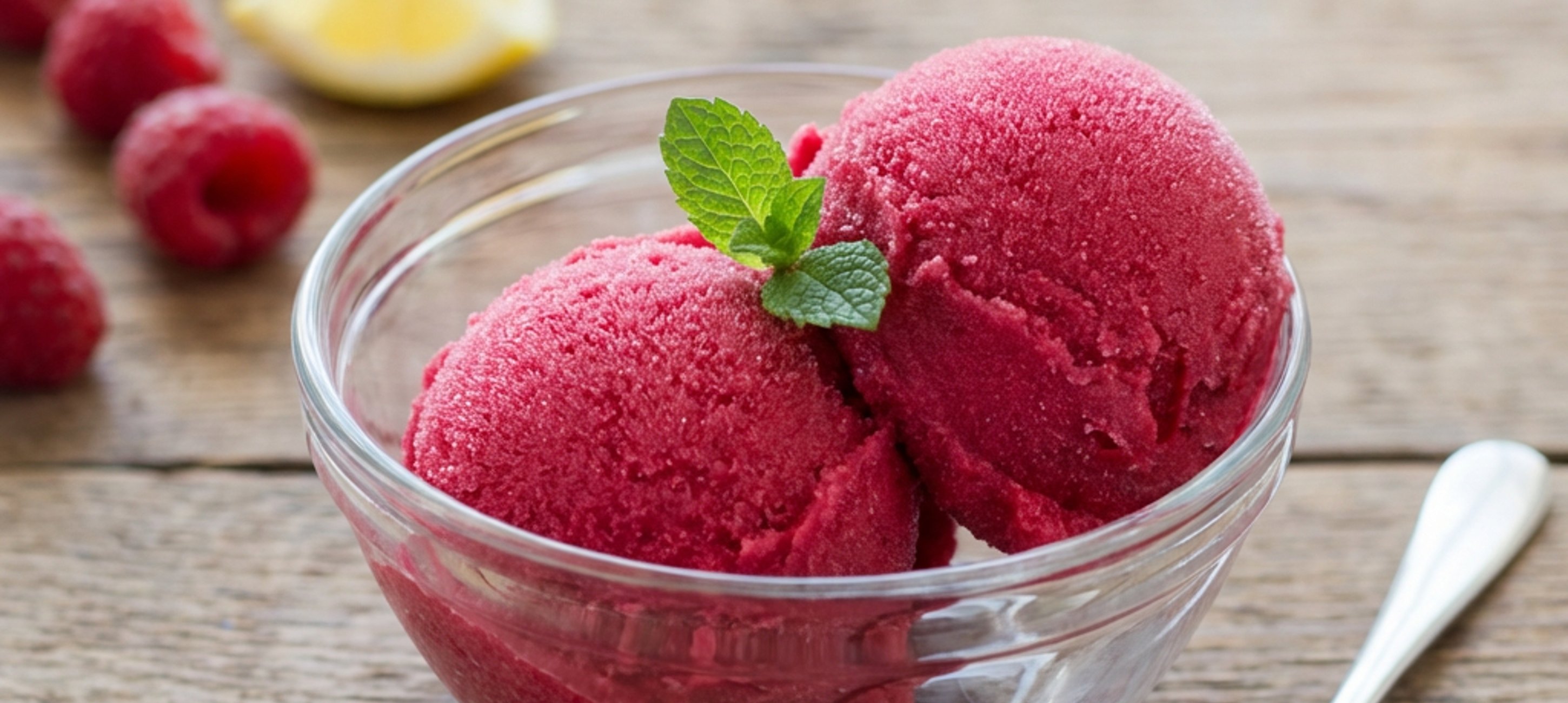 Du kannst die Himbeeren auf ganz einfach gegen andere Beeren austauschen und dir zum Beispiel ein fruchtiges Erdbeer- oder Blaubeer-Sorbet zaubern.