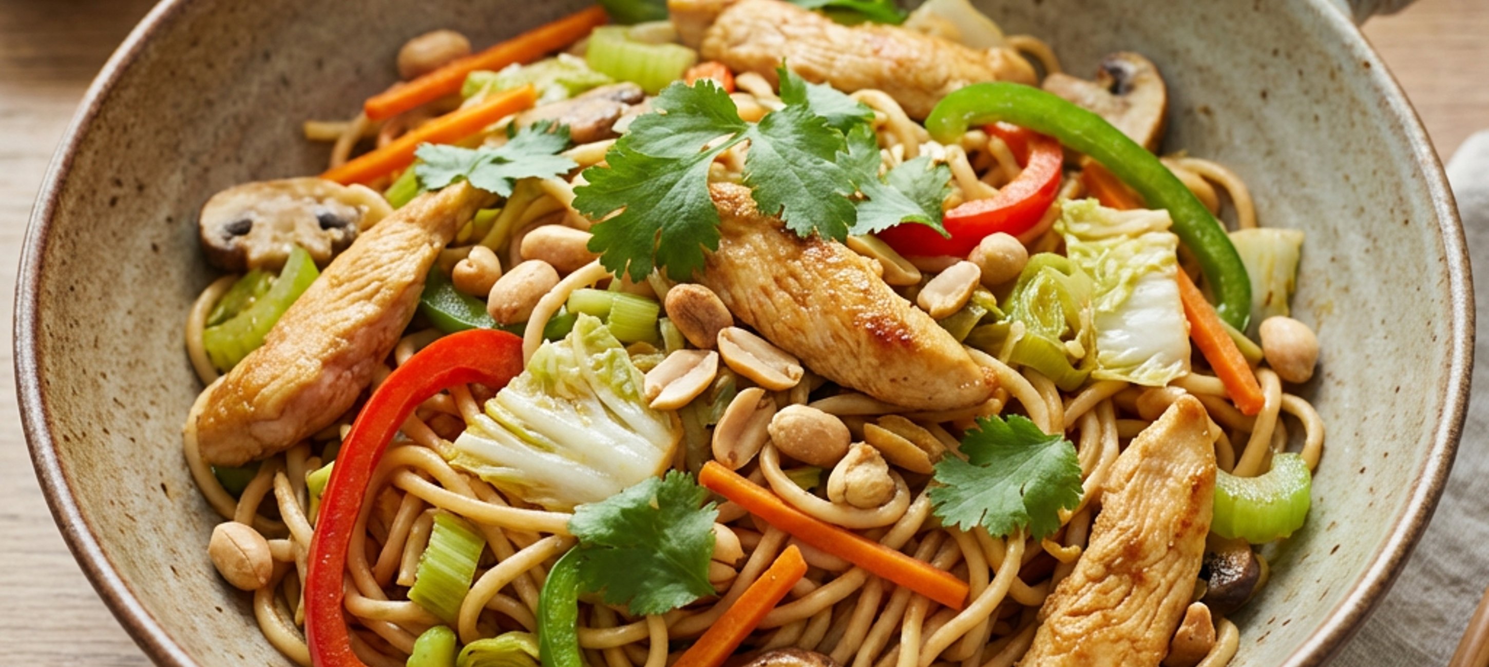 - 7Die gebratenen Nudeln auf Tellern anrichten und mit den gerösteten Erdnüssen bestreut servieren. Am besten eignet sich für die Zubereitung eine Pfanne mit ca. 32 cm Durchmesser.