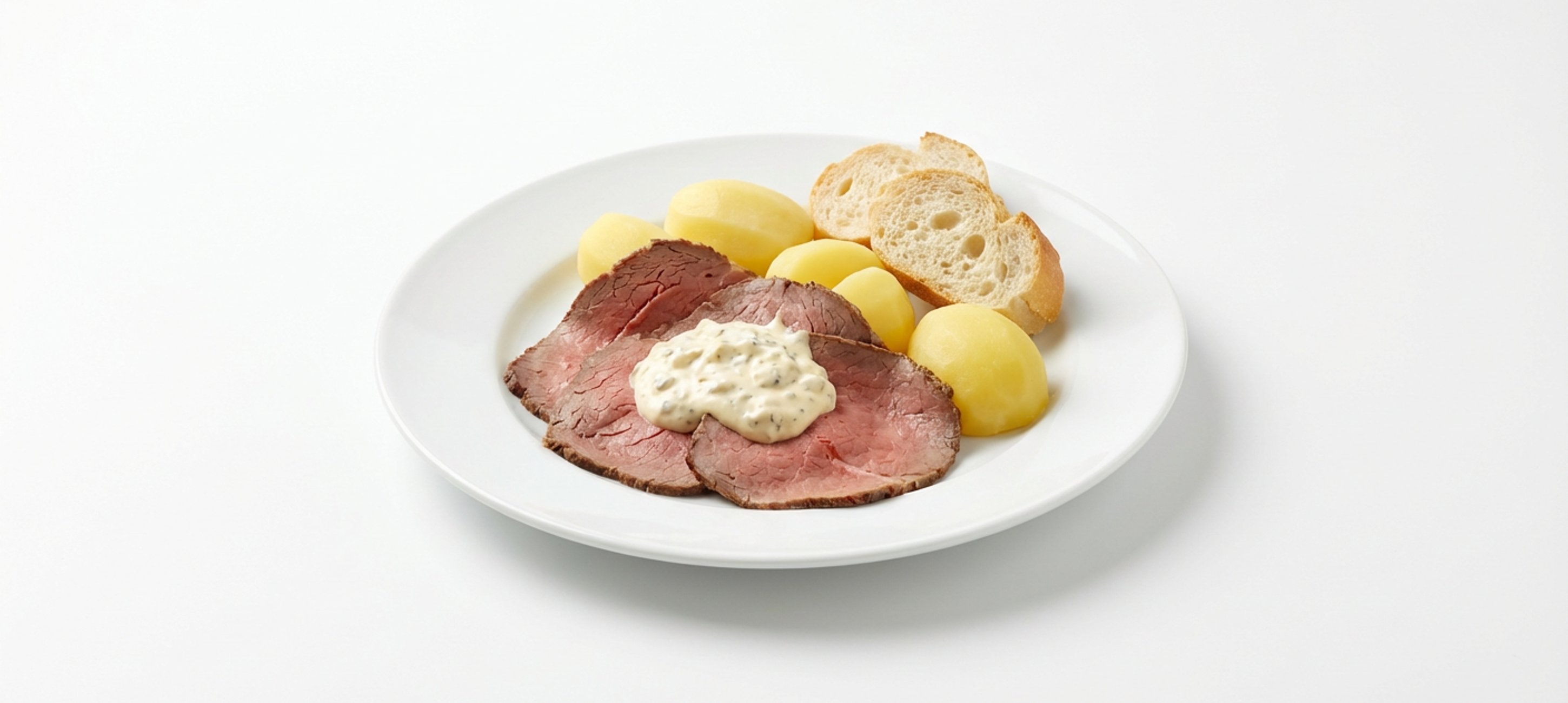 - 7Das Roastbeef in hauchdünne Scheiben schneiden und mit gekochten Erdäpfeln und der Remoulade (oder Tatarsauce) servieren. Auch Baguette passt hervorragend dazu.