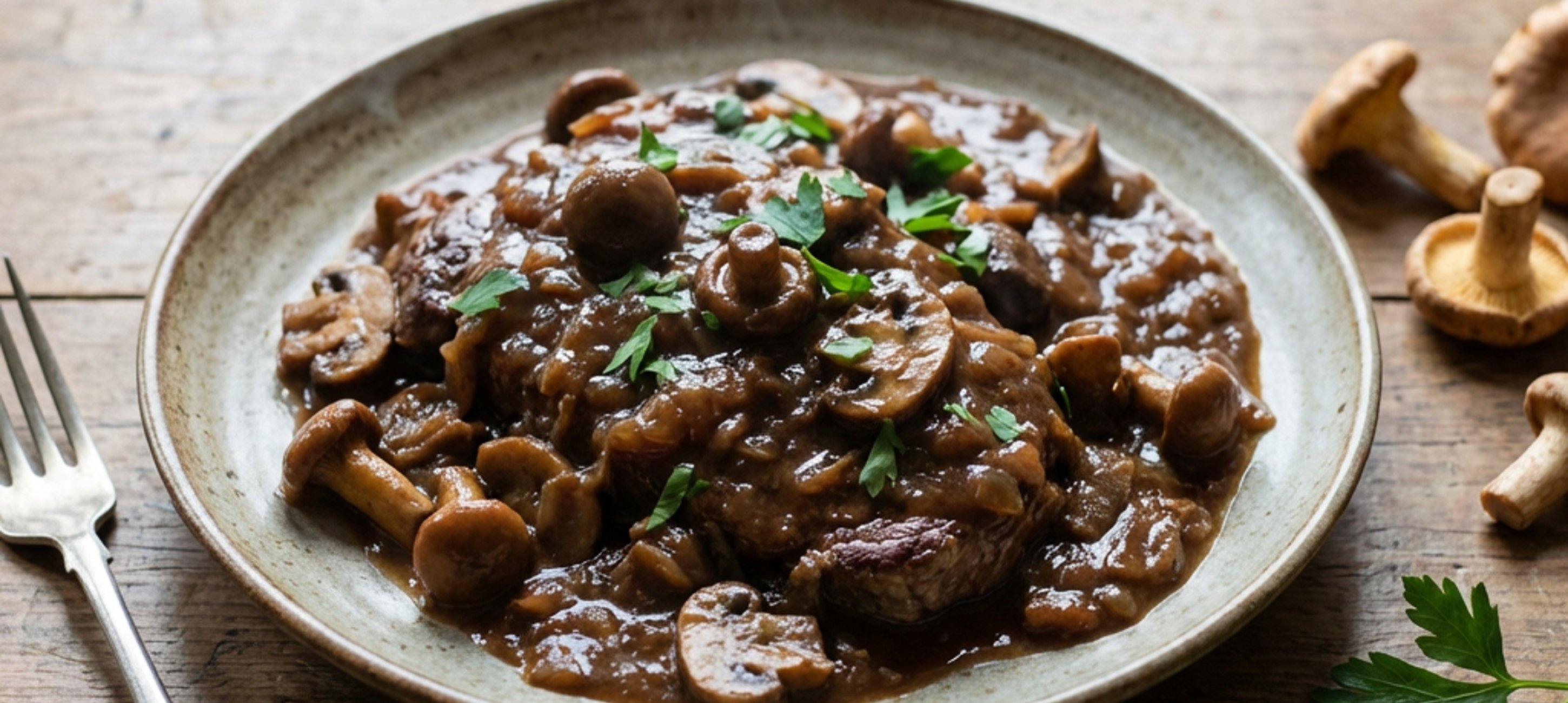 - 6Nach etwa 30 Minuten Schmorzeit die angebratenen Pilze und den restlichen Fond zum Fleisch geben. Weiter dünsten, bis das Fleisch butterweich ist (die Dauer hängt von der Fleischqualität ab).