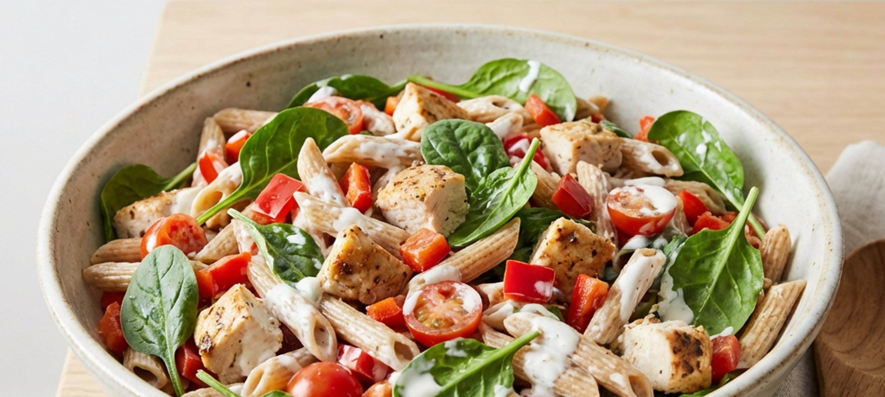 - 5In einer großen Schüssel die gekochten Nudeln, das gebratene Hendl, die Paprikawürfel, die halbierten Kirschtomaten und den Babyspinat vermengen. Das Joghurt-Dressing unterheben und alles gut vermischen. Den Salat nach Bedarf nochmals mit Salz und Pfeffer abschmecken.