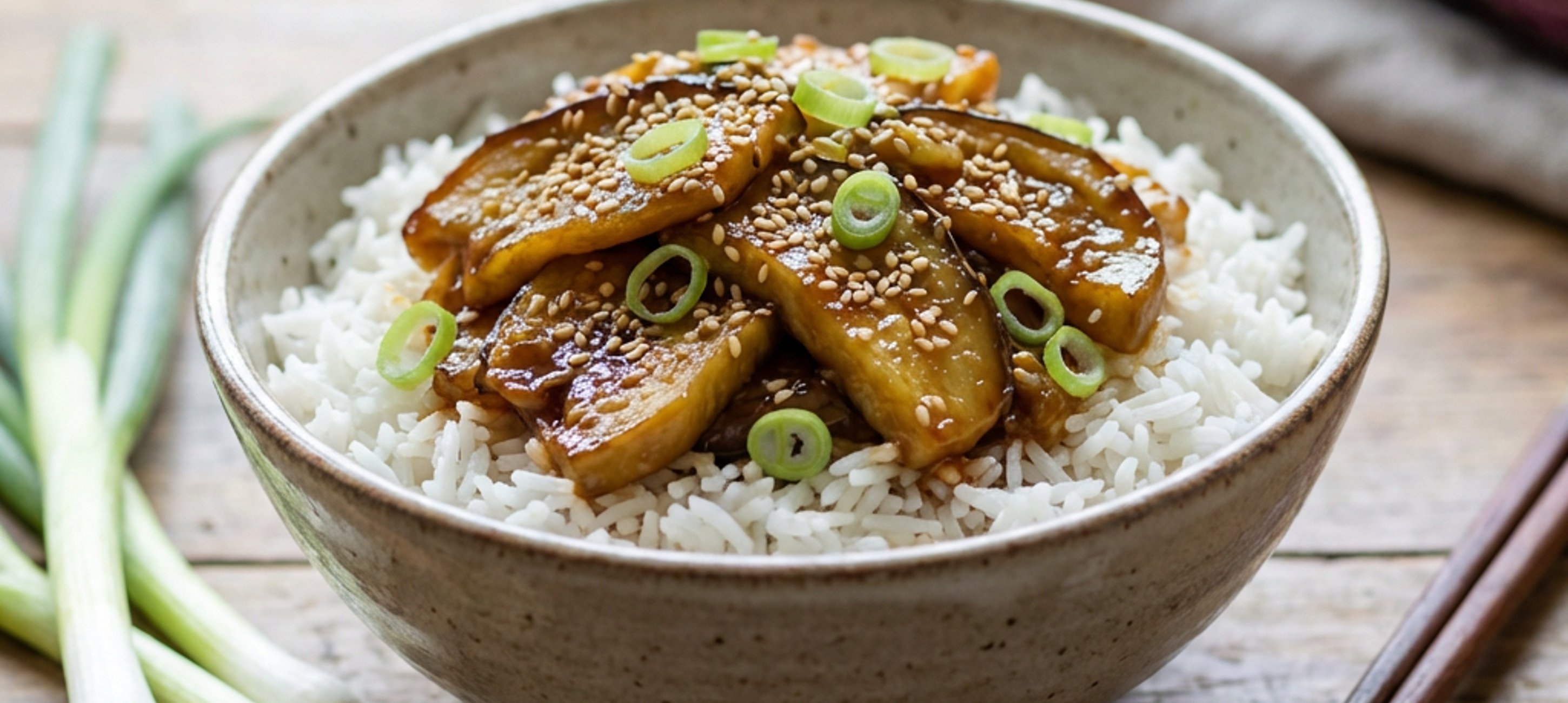 - 2Öl in einer Pfanne erhitzen, Melanzanischeiben von beiden Seiten goldgelb anbraten. Alle Zutaten für die Sauce verrühren, zur Melanzani geben, 5 Minuten bei mittlerer Temperatur einkochen lassen. Auf Reis anrichten und mit Sesamsamen und Frühlingsziebelringen bestreuen.