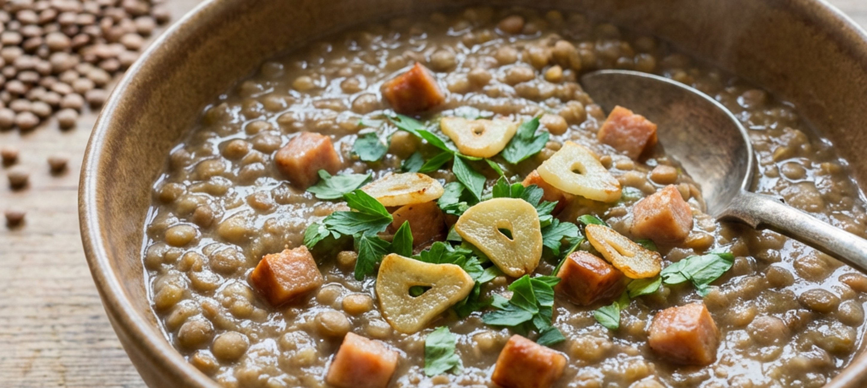 - 5Tipp: Achten Sie darauf, dass der Knoblauch beim Anbraten nicht zu dunkel wird, da er sonst bitter schmeckt. Durch die pürierten Linsen wird die Suppe natürlich gebunden, eine klassische Einbrenn ist daher nicht nötig – so bleibt das Gericht von Natur aus glutenfrei. Wer es vegetarisch mag, ersetzt die Rinderbrühe durch Gemüsebrühe und lässt das Selchfleisch einfach weg.