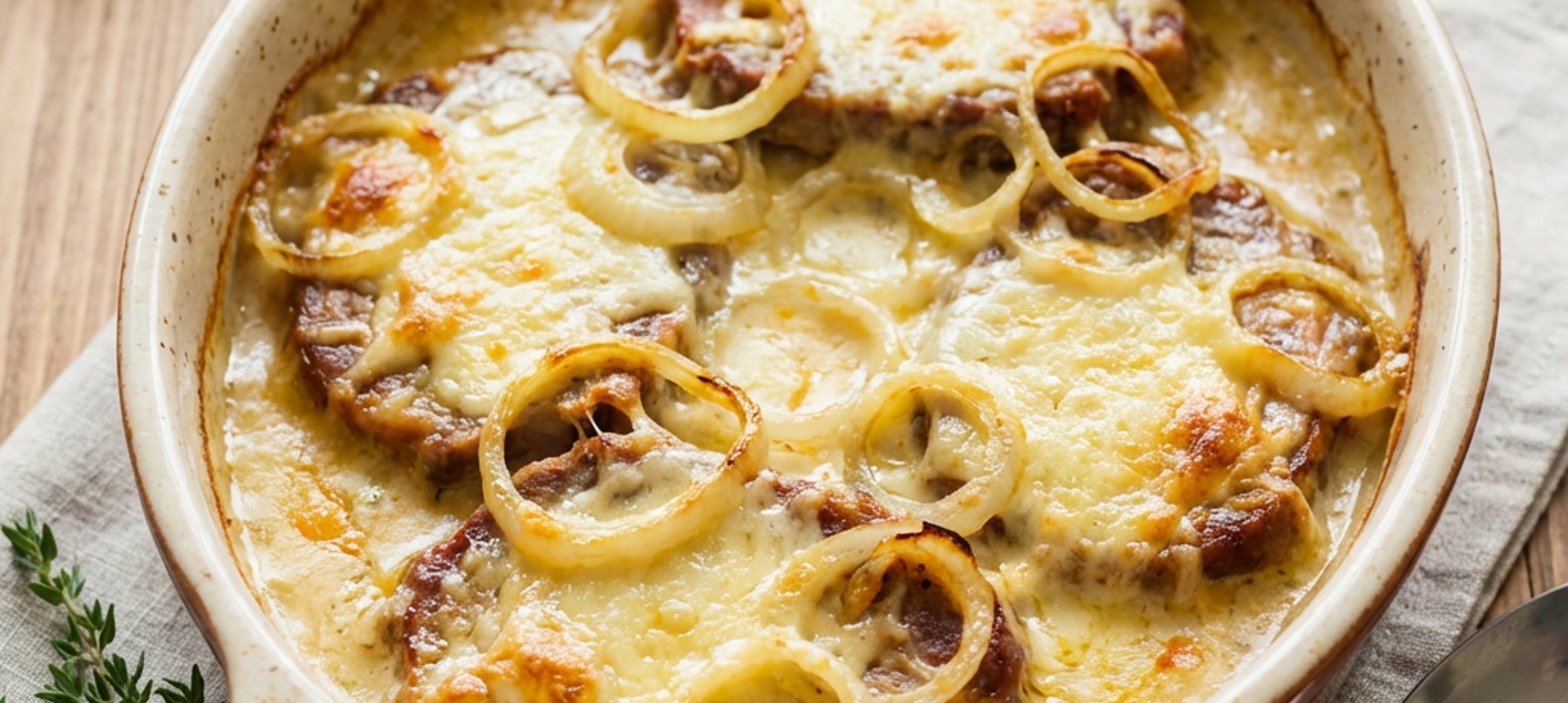 - 4Die Champignons auf dem Fleisch verteilen, darauf die Zwiebelringe schichten und alles großzügig mit dem geriebenen Käse bestreuen. Das Schlagobers darüber gießen, mit einer Prise Paprikapulver bestreuen und im vorgeheizten Ofen ca. 1,5 Stunden backen.