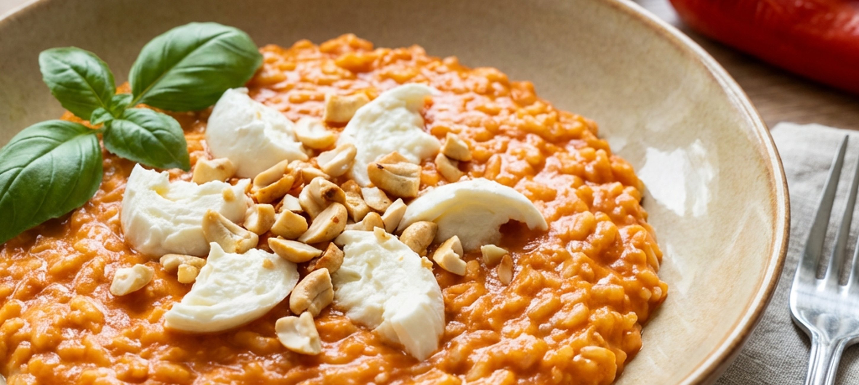 - 7Mit Salz und Pfeffer würzen und unter ständigem Rühren köcheln lassen, bis der Reis bissfest (al dente) ist. Sobald der Reis die richtige Konsistenz hat, die restliche Butter und die vorbereiteten Paprika (Würfel oder Püree) unterrühren.