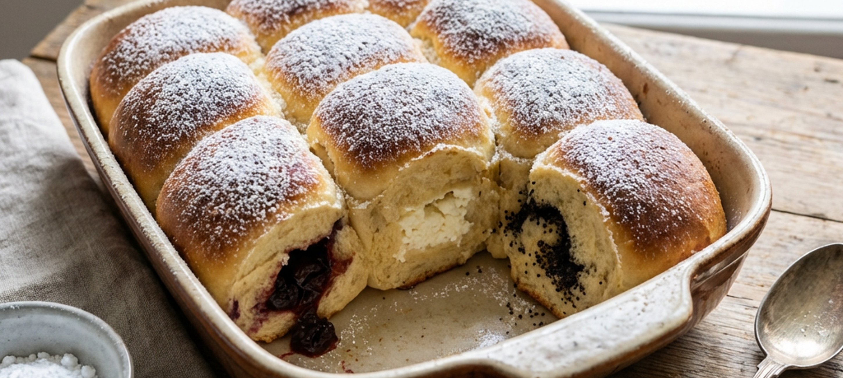- 5Eine Auflaufform großzügig mit geschmolzenem Schweineschmalz ausstreichen. Die Buchteln mit dem Verschluss nach unten nebeneinander in die Form setzen. Jede Buchtel rundherum gründlich mit Schmalz bestreichen. Zum Schluss auch die Oberseite mit dem restlichen Schmalz bestreichen. Im vorgeheizten Ofen ca. 50–60 Minuten goldbraun backen.