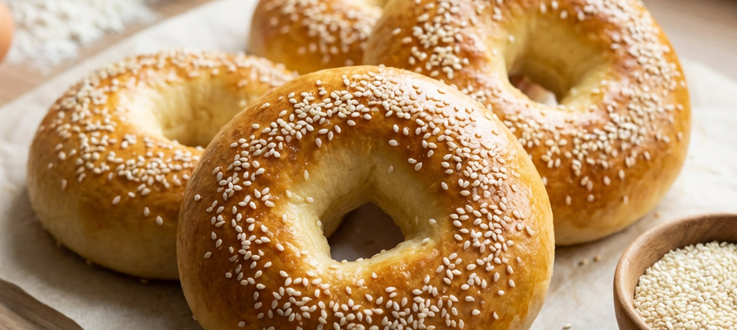 - 3Den Teig in 4 gleich große Stücke teilen (ca. 80 g pro Stück). Jedes Stück zu einer flachen Scheibe formen, in der Mitte ein Loch drücken und zu einem Bagel formen. Die Bagels auf das Backblech legen, mit dem verquirlten Ei bestreichen und großzügig mit Sesam bestreuen.