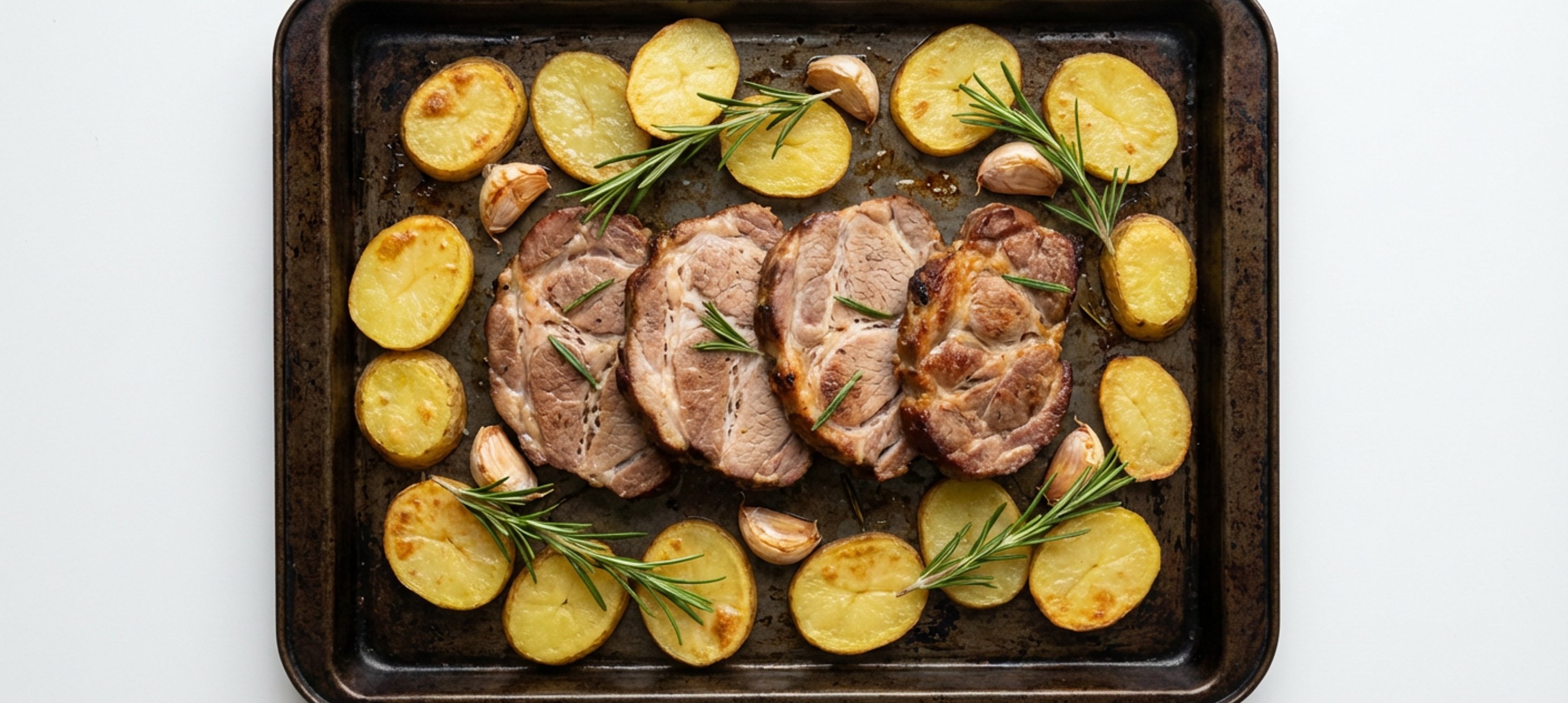 - 4Etwas Wasser angießen und im vorgeheizten Ofen ca. 1 Stunde braten, bis das Fleisch saftig und die Erdäpfel weich sind.